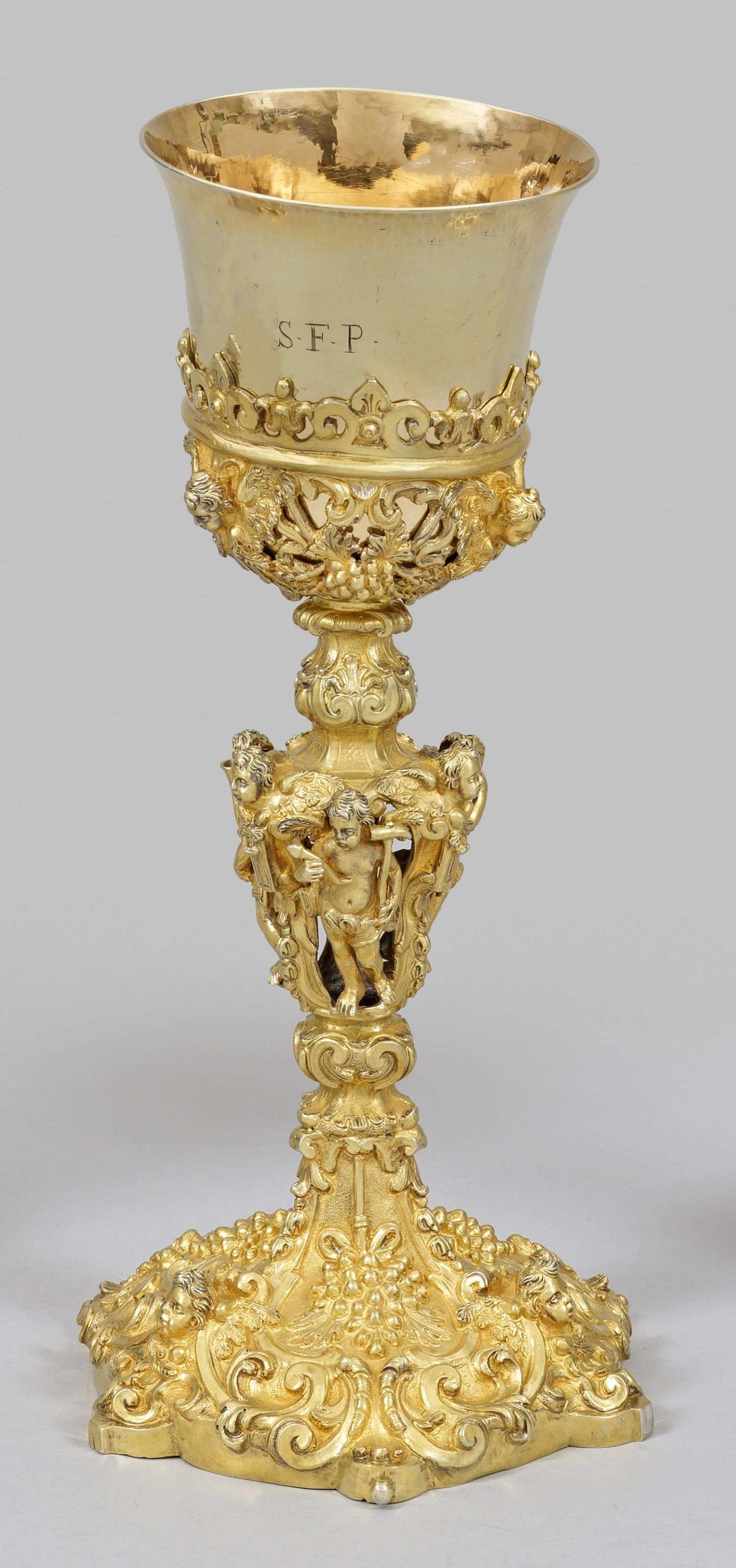 Silber, vollvergoldet. Über sechseckigem Fuß durchbrochen gearbeiteter, mit vollplastischen Putten umzogener Schaft und runde Kuppa mit leicht ausschwingendem Rand. Fuß und untere Wandungshälfte der Kuppa mit C-Schwüngen, Weinreben und Puttenköpfen üppig ornamentiert. Kuppa monogr. "S. F. P.". H. 26 cm. Gew. ca. 885 g.