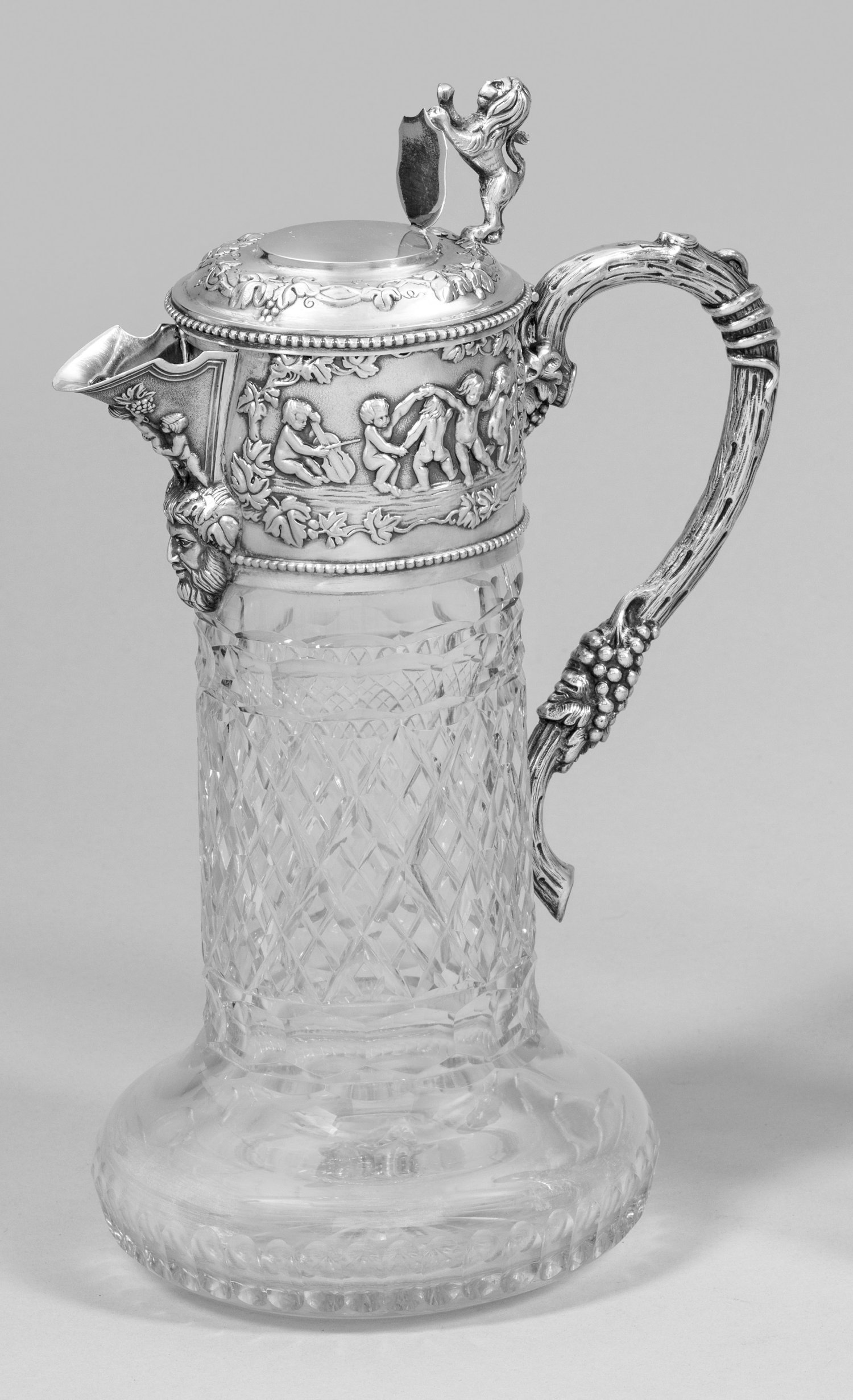 Sterlingsilber und farbloses Glas mit facettiertem Schnittdekor. Gedrückter Korpus mit hohem, zylindrischem Hals. Silbermontierung mit rückseitigem Asthenkel und scharniertem Deckel bekrönt von einem Löwen, der ein leeres Wappenschild hält als Daumenrast. Hals umlaufend reliefiert mit Weinranken und spielenden Putti. Bacchusmaskaron unter dem kurzen, hoch angesetzten Ausguss. Gest. 925, Herstellermarke. Ges.-Gew. 1510 g. H. 29 cm.