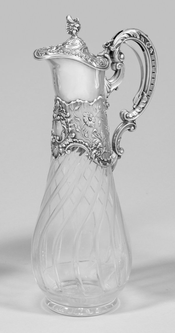 Silber und Glas. Über rundem Fuß mit Bodenschliffstern konischer Glaskorpus mit geschweiften Zügen. Montierung aus Silber mit leicht ausgestellter Schnaupe, scharniertem Deckel mit Rocaillenknauf, Öffnungsmechanik und mehrfach volutiertem Henkel. Reliefiert und graviert mit Voluten-, Akanthusblatt- und Blütendekor in Schlangenhautfond. Innen vergoldet. Modell-Nr. A10874. Gest. 800, Herstellerzeichen, Händlermarke "Sy & Wagner." Ges.-Gew. ca. 1070 g. H. 33 cm.