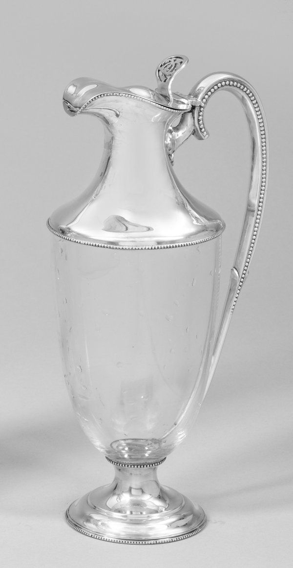 mit Sterlingsilbermontierung. Trompetenförmiger Stand, übergehend in schmalen, ohrenförmigen Henkel und konischen Glaskorpus. Abgesetzte, glatte Schulter und schlanker Hals in seitlichem Ausguss endend. Scharnierter Deckel mit blattförmig, durchbrochen gearbeitetem Drücker. Die Korpusränder umzogen mit zartem Perlband. Gest., Beschaumarke, Herstellerzeichen, Jahresbuchstabe "f". H. 31 cm. Ges.-Gew. 960 g.