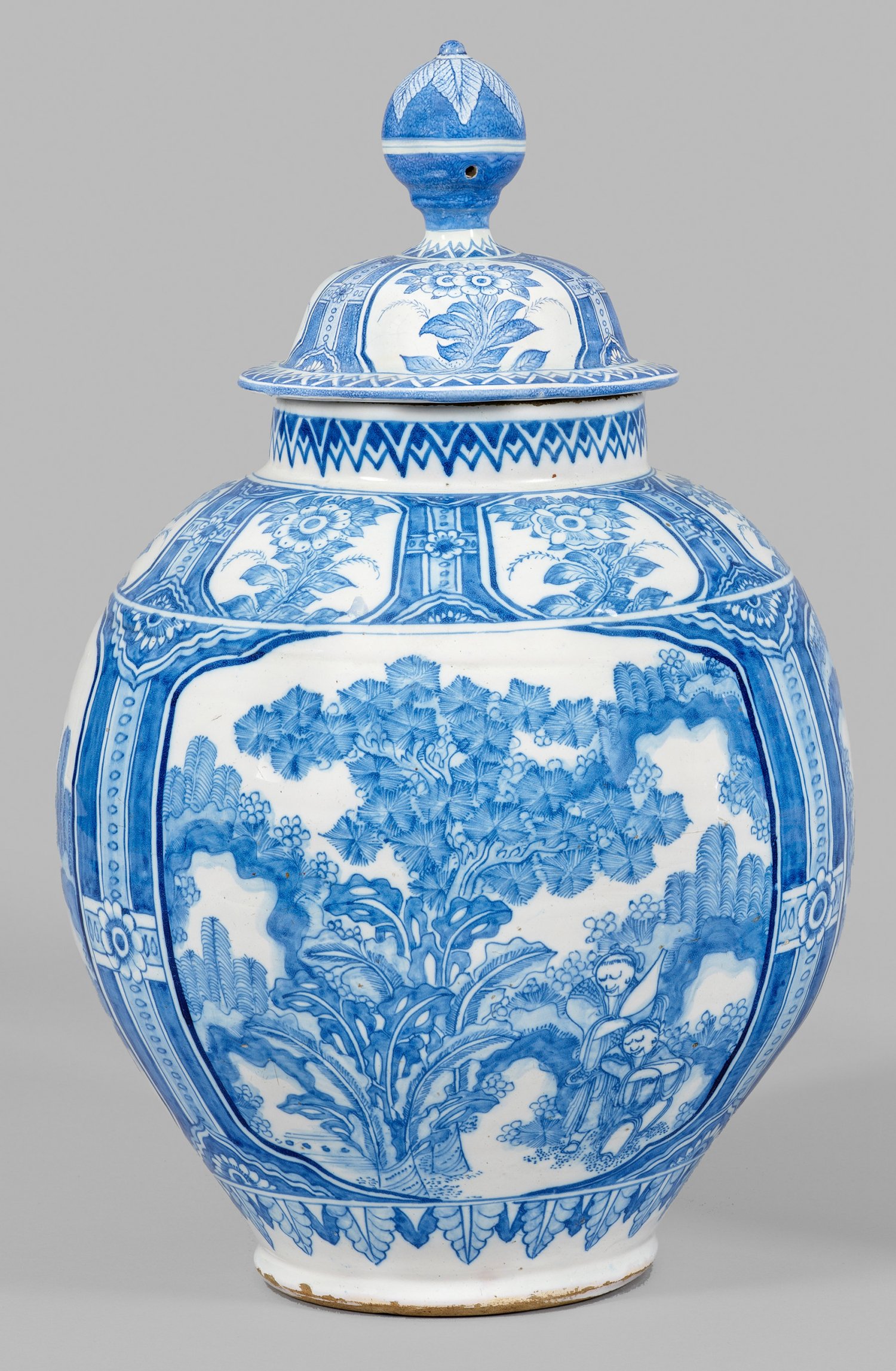 Fayence. Ovoide Form, zum Stand und zur Schulter durch ein Profilband akzentuiert, glockenförmiger Deckel mit ovoidem Knauf. Reicher, flächendeckender, hellkobaltblau gemalter Scharffeuerdekor, die Wandung durch drei Kreuzbänder in große Bildfelder mit chinesischen Figuren in Landschaften aufgeteilt. Auf Schulter und Deckel florale Kartuschen, abgetrennt durch gleichartige Kreuzbänder. Deckel wohl erg. oder rest.; Zeichenmarke. Etikett der Slg. Schafft mit Nr. 90. H. 44 cm.