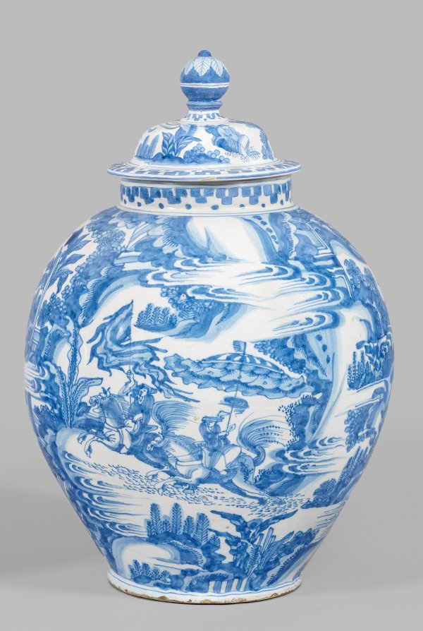 Fayence. Ovoide Form mit kurzem Zylinderhals, Glockendeckel, kugeliger Knauf. Reicher, nahezu flächendeckender Dekor in hellem Kobaltblau. Umlaufender, mehrfiguriger, szenischer Dekor mit Chinesen in Landschaft, am Hals und Deckelrand Schachbrettfriese. Lippenrand rest.; Christie's-Etikett mit Dat. 21.9.(19)92 u. Nr. 158. H. 40 cm.