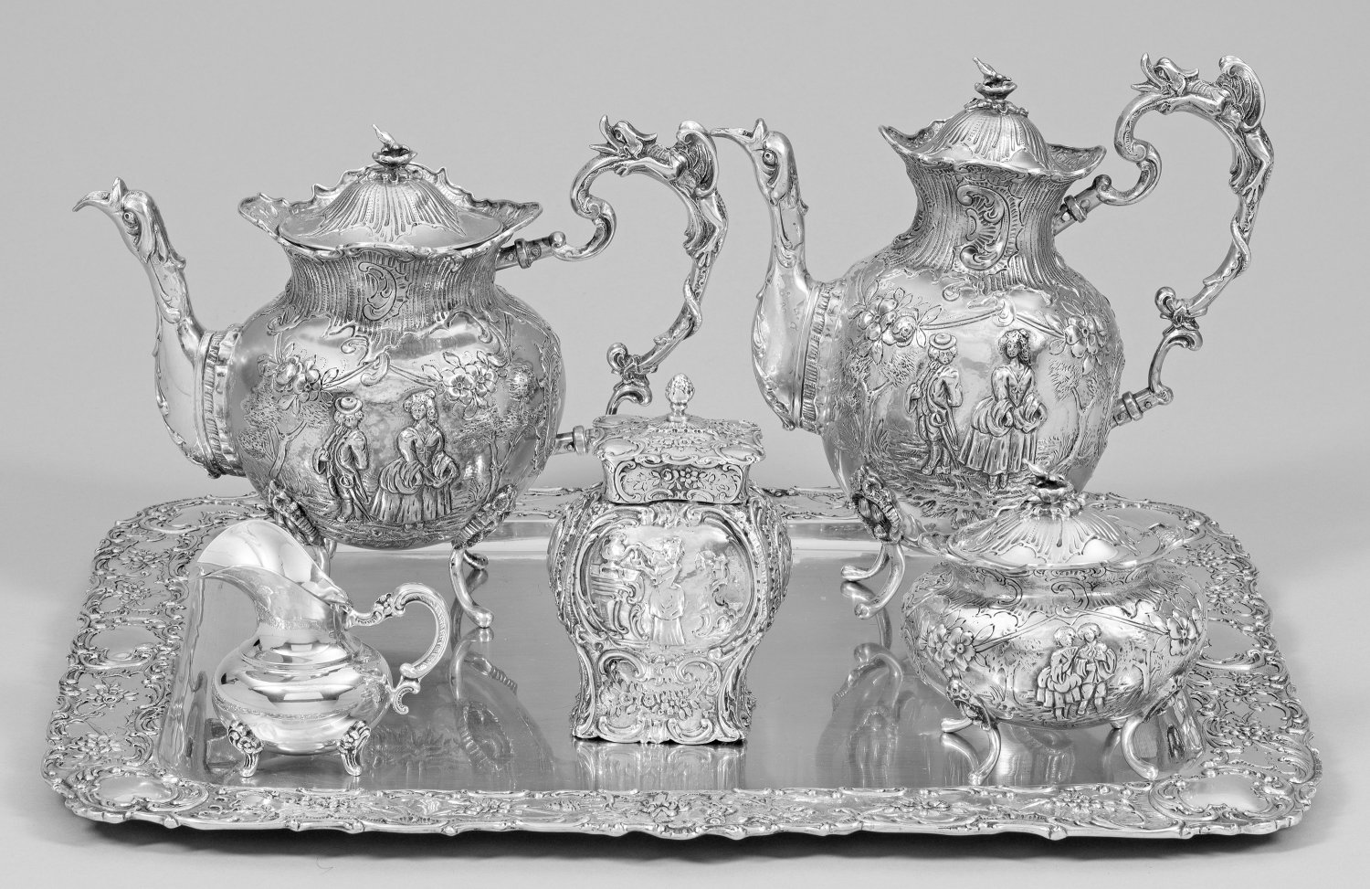 Silber. 6-tlg.; Kaffee- und Teekanne, Zucker- und Teedose, Sahnegießer, Tablett mit Glasscheibe. Rechteckiges, abgerundetes Tablett mit glattem Spiegel und reliefierter Fahne. Auf geschwungenen Füßen runder bzw. rechteckiger bauchiger bis ovoider Korpus mit teilweise scharnierten Deckeln und stark reliefierter Wandung mit Blumen, Rocaillen und Watteau-Szenen. Knäufe in Blüten- oder Zapfenform, Fabelwesenköpfe als Ausguss. Sahnegießer mit abweichendem Dekor. Gest. 13 Lot, 925. Pseudomarken. Gew.-zus. (ohne Glas) ca. 3590 g. Kannen-H. 21 cm - 23 cm. Tablett 47 cm x 40,5 cm.