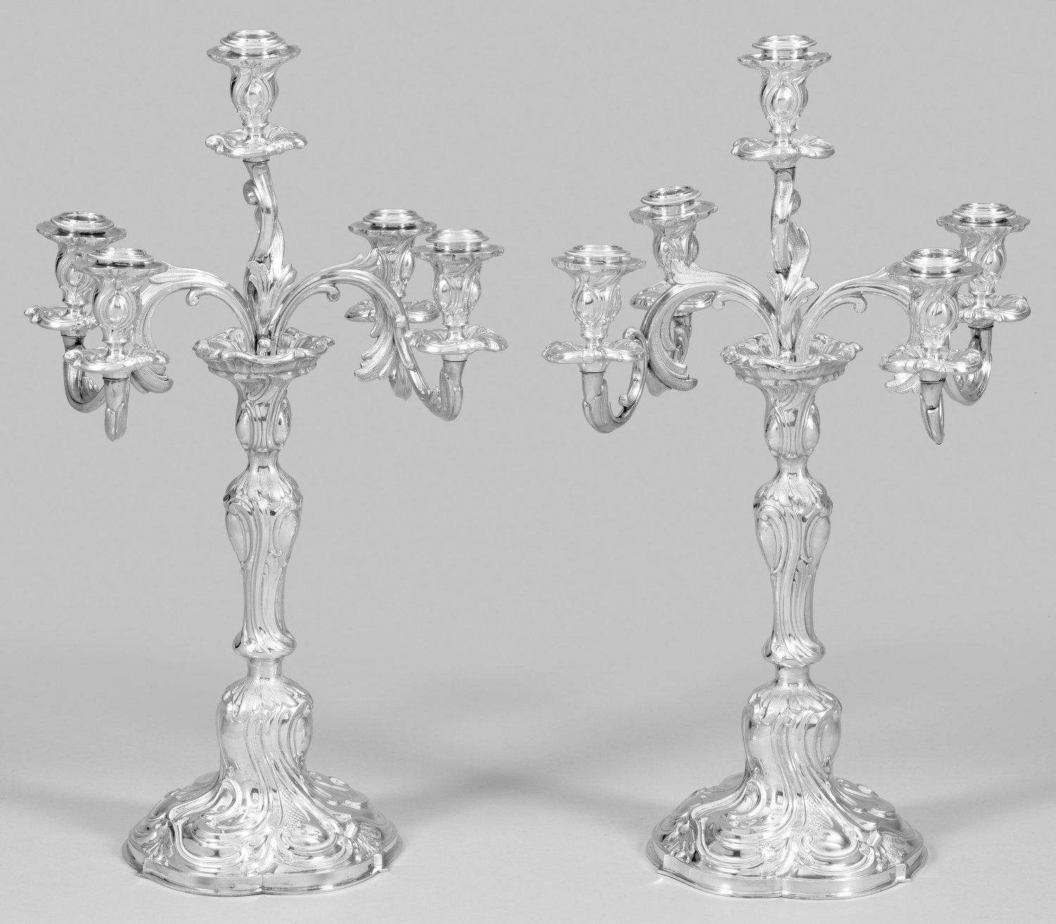 Silber. 5-flg.; Über passig geschweiftem, leicht gewölbtem Stand hoher, mehrfach gegliederter Balusterschaft. Flächendeckender Reliefdekor aus Voluten, Rocaillen und Netzgitterwerk. Einsatz aus 5-armigen, abnehmbaren Aufsätzen, somit auch als Kerzenleuchter für eine Kerze nutzbar. Tüllen mit feinen Kordelband-Rändern. Beschw.; Gest. 750, Herstellerzeichen. Ges.-Gew. ca. 3300 g. Ges.-H. 49,5 cm.
