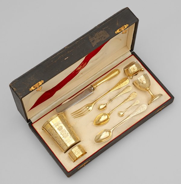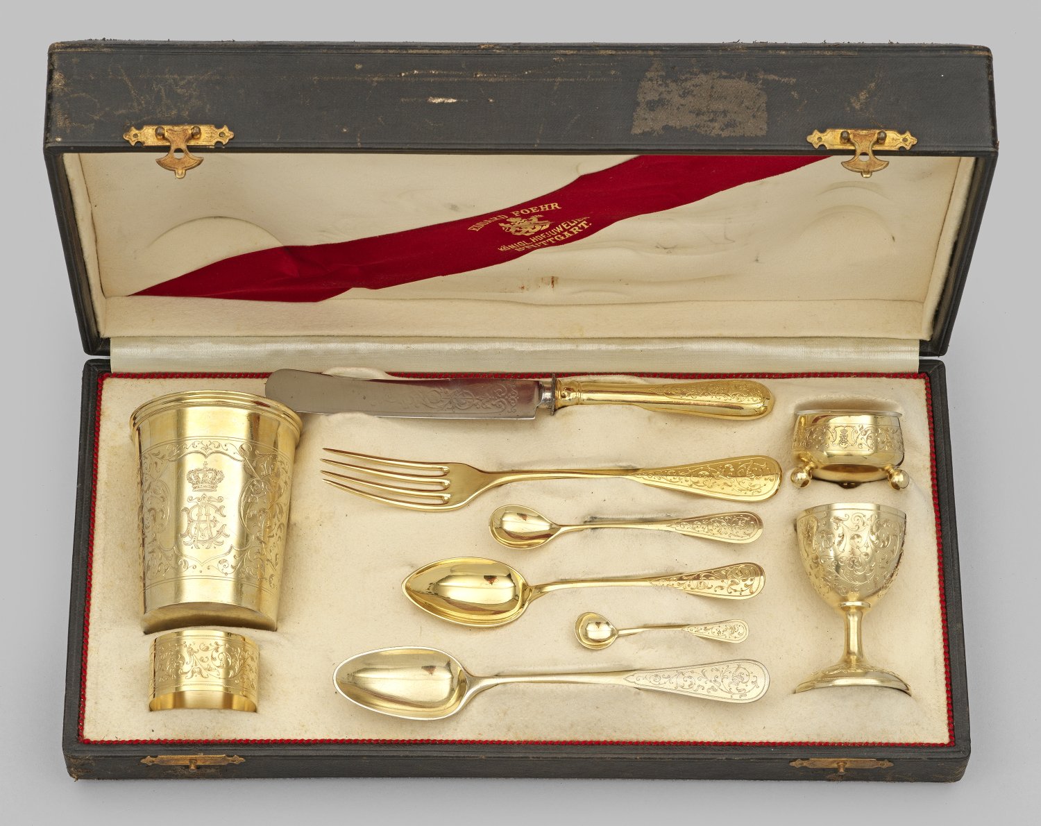 Silber, vergoldet. 10-tlg.; Becher, Eierbecher, Salzfass, Serviettenring, Messer, Gabel, Gewürz-, Eier- und 2 Esslöffel. Runde Grundform, teilw. mit Kugelfüßen oder Trompetenfuß, Besteckgriffe tropfenförmig. Fein gravierter Dekor aus Spiralen und Blattwerk sowie Profillinien. Teilw. mit bekröntem Monogramm "AE" für Herzog Albrecht Eugen von Württemberg (1895 - 1954). Gest. 800, Herstellerzeichen. Gew. zus. ca. 430 g. Becher-H. 9 cm. Messer-L. 20,5 cm.