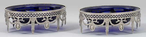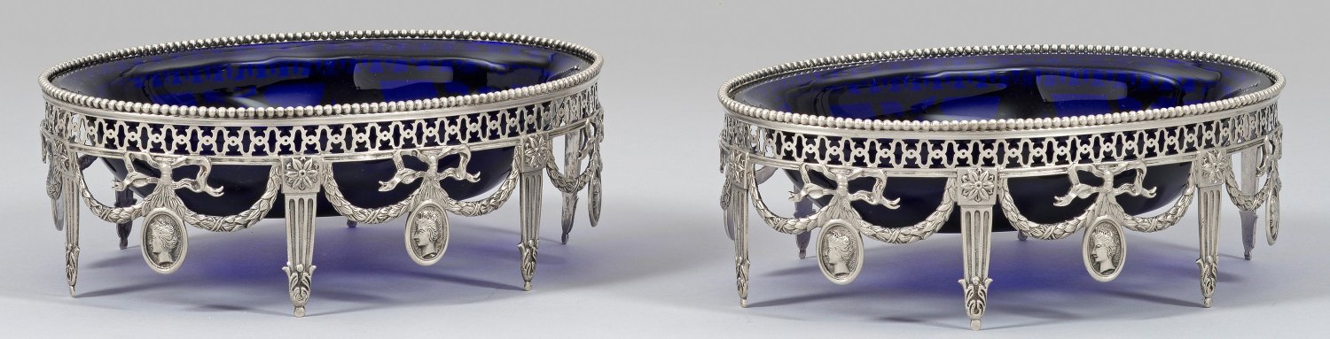 Silber und Glas. Ovale Form. Über sechs geraden, kannelierten Füßen durchbrochen gearbeiteter Rand mit Perlstabdekor. Daran herabhängend Lorbeergirlanden, Schleifen und ovale Porträtmedaillons. Blauer Glaseinsatz. Beschau- und undeutl. Herstellerzeichen, Jahresbuchstabe "I". Gew. (ohne Glaseinsatz) ca. 755 g. H. 8 cm. 24 cm x 16,5 cm.