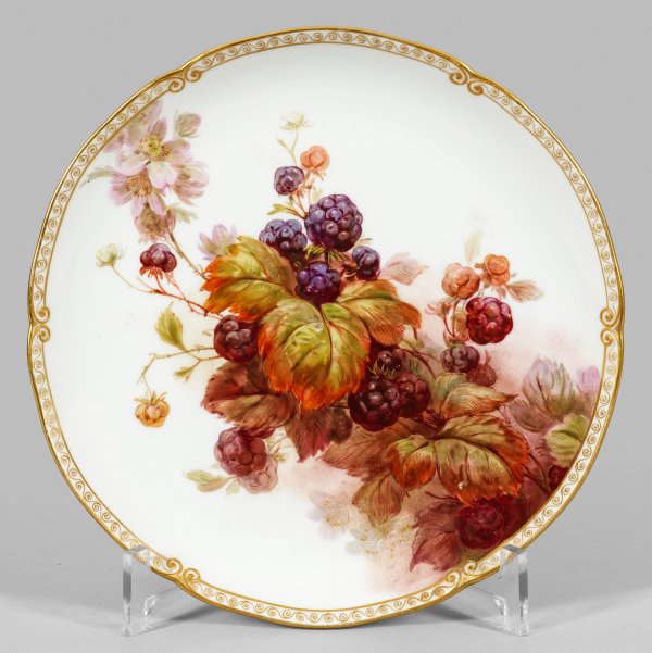 Runde, leicht vertiefte Form mit passig geschweiftem Goldrand. Im Spiegel großflächig angelegter Brombeer-Strauch mit Blättern, reifen Früchten und Blüten in weicher, polychromer Malerei. Goldstaffage mit Reliefgold-Voluten. Minim. ber.; Zeptermarke. D. 21,5 cm.
