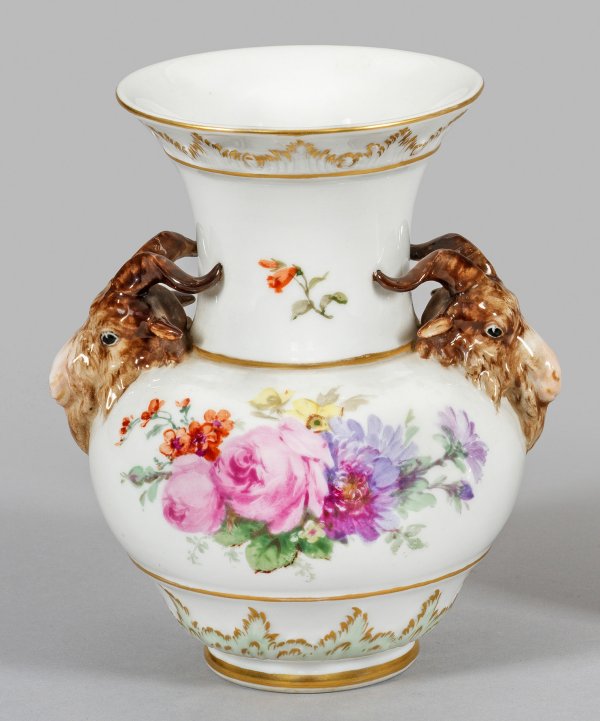 Gedrückt bauchiger, von Blattreliefbordüren umzogener Korpus mit gerundeter Schulter, abgesetztem, langem Hals und ausschwingendem Lippenrand. Seitlich ansetzende, plastische Widderköpfe als Handhaben. Beidseitig der Wandung, farbenprächtige Blumenarrangements in feiner, weichtoniger Malerei von Franz Aulich. Goldrand. Maler-Sign.; Zeptermarke. H. 17 cm.