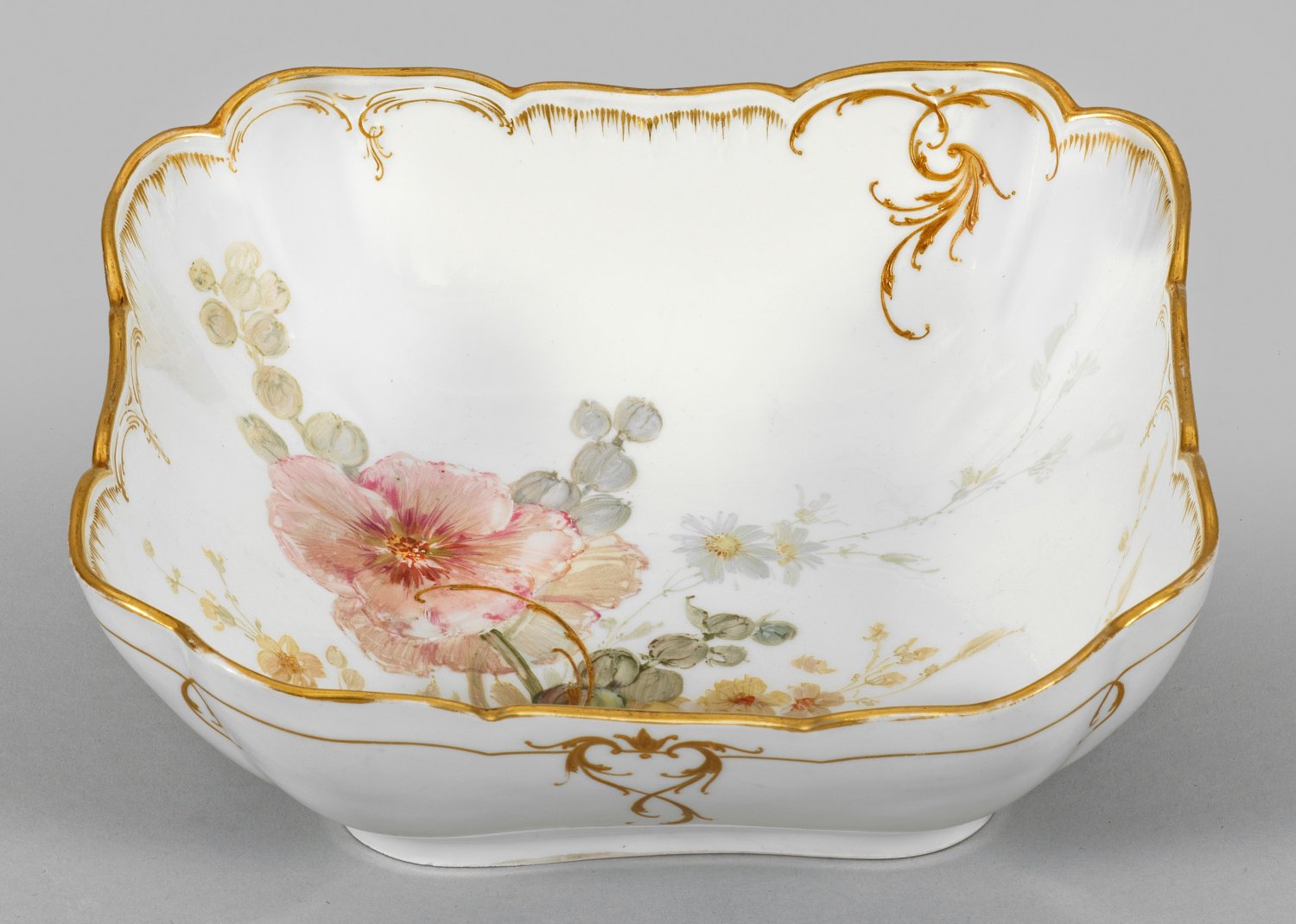 sog. "Kompottnapf" für das Tafelservice "Neuglatt". Rechteckige Form mit schräg ansteigender Wandung und passig geschweiftem Goldrand. Im vertieften Spiegel großflächig angelegtes, weit verzweigtes Blütenarrangement in teilw. weißgehöhter, polychromer Weichmalerei. Umlaufend der Außenwandung sowie oberhalb der Innenwandung, sich bis in den Spiegel ausbreitende, feine Reliefgoldranken. Goldstaffage. Unw. ber.; Jahreszeichen. Zeptermarke. D. 26 cm.