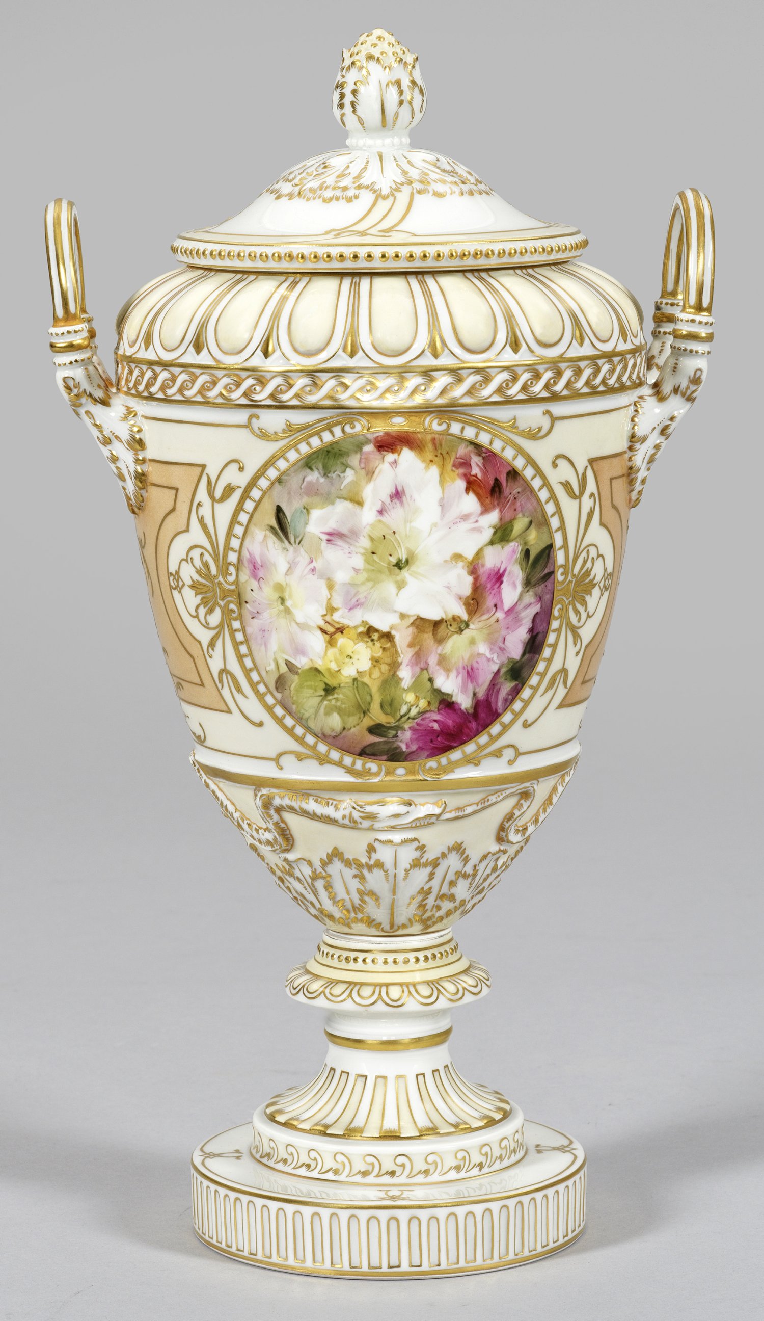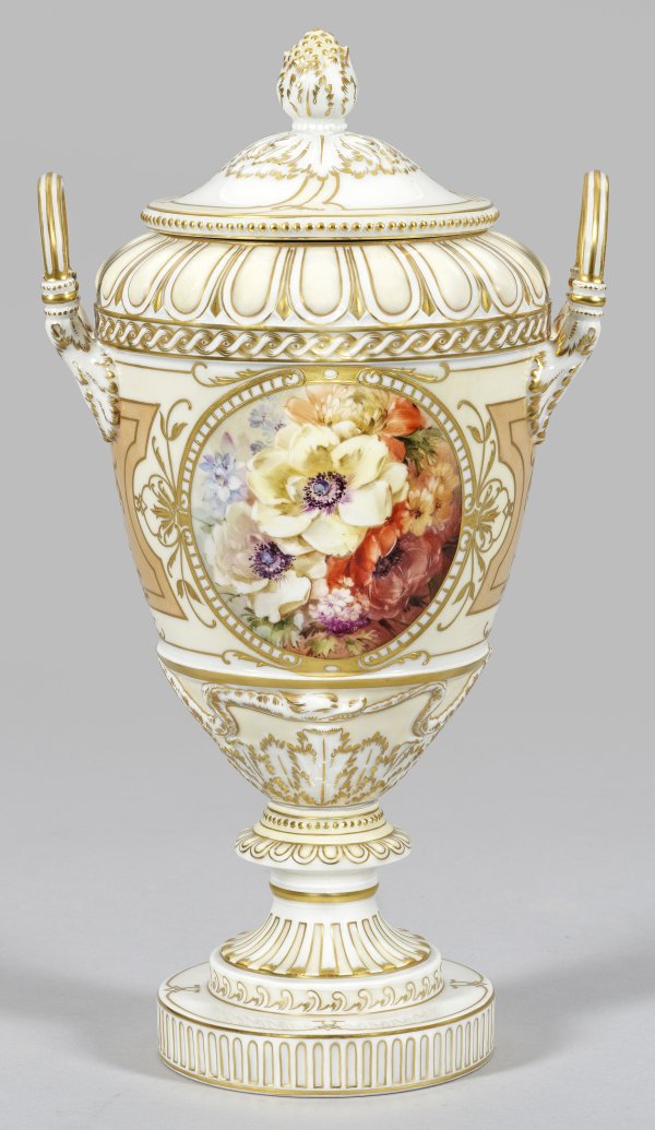 Über gestuftem, mehrfach gegliedertem Rundfuß ovoider Vasenkorpus. Seitlich, aus reliefiertem Blattansatz hochgezogene, kannelierte Bügelhenkel. Korrespondierender, aufgewölbter Deckel mit Knospenknauf über Blattrosette. Umlaufend unterschiedlich reliefierte Ornamentfriese aus Wellen- und Flechtband, Stab-, Perl- und Zungenfries, teilw. mit Schlangenrelief. Pastelltonige Farbfonds. Beidseitig der Wandung im ovalen Medaillon dichte Blumenarrangements mit Anemonen bzw. Azaleen mit zarttonig verlaufendem Blatt- und Blütenfond in sog. Weichmalerei. Montierung locker. Zepter-, Malerei- und Gedächtnismarke (Eisernes Kreuz). H. 35 cm.