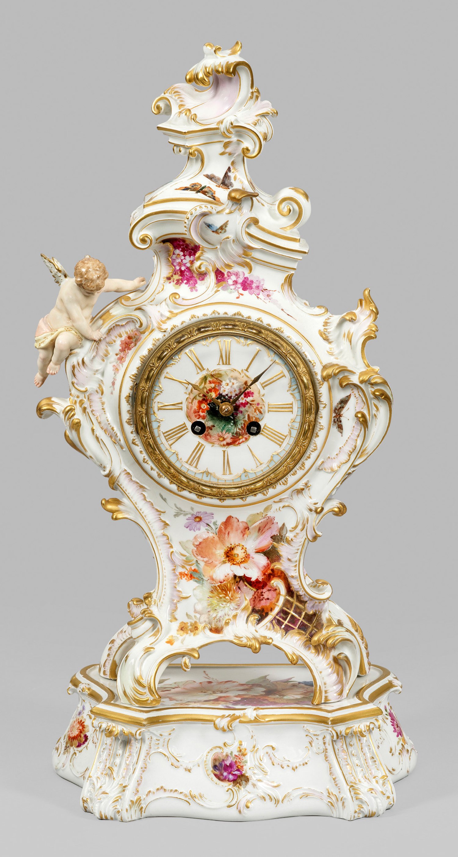 2-tlg.; Trapezförmig geschweifter Sockel mit pilasterförmig hervorkragender Gliederung und Akanthusblättern. Allseits rocailleförmig umzogene Reliefkartuschen. Auf vier Füßen stehender, balusterförmiger, stark geschweifter, durch Muschel- und Blattvoluten konturierter Korpus bekrönt von korrespondierend architektonischem Aufbau. Sich an die Schulter klammernde Figur eines vollplastischen Puttos. In den Freiflächen sowie im Spiegel des Sockels farbintensive Blumenbuketts und Blütenarrangements mit fliegenden Schmetterlingen in zarttonig verlaufender, polychromer Weichmalerei mit Weißhöhungen. Dezente pastelltonige Farbfonds sowie reiche Goldstaffage. Sockel mit Malerzeichen für Blumenmaler Anton Herder (geb. 1889; tätig in der KPM von 1903 bis 1935). Form-Entw. Robert Schirmer, 1885. Modell-Nr. 3105. Mittig runde Verglasung mit Bronzefassung. Porzellanzifferblatt mit goldenen, römischen Zahlen. Pendeluhrwerk mit Pendelfeder. Halbstundenschlag auf Glocke. Platine bez. Lenzkirch. Unw. rest.; Zepter- und Malereimarke. Ges.-H. 52,5 cm. Sockel 26 cm x 16 cm x 7,5 cm. Uhren-H. 45 cm.