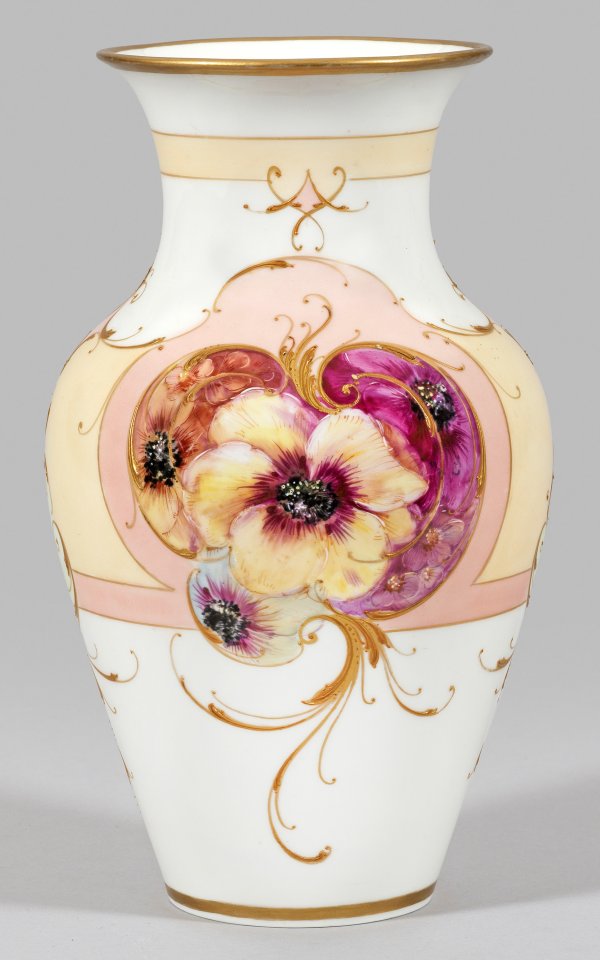 sog. "Chinesische Vase". Über dem Rundstand gestreckt ovoider Korpus mit eingezogener Schulter und ausschwingender Mündung. Beidseitig zentral der Wandung, von passig geschweiften Reliefgoldreserven umzogene Mohnblüten bzw. Blumen in polychromer Weichmalerei. Umlaufend feine Reliefgoldfelder und Ornamente mit zarttonig pastellfarbenem Fond in Rosa, Gelb und Mintgrün. Goldrand erneuert. Form-Entw. Julius Wilhelm Mantel. Malerkürzel. Zeptermarke. H. 27 cm.