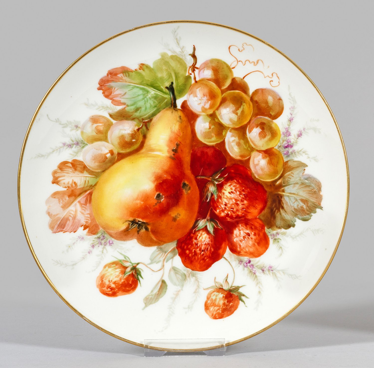 Runde, flach gemuldete Form mit glattem Goldrand. Im Spiegel Früchtebukett aus Birne, Erdbeeren und hellen Trauben in weicher, polychromer Malerei. Rücks. Wandmontierungslöcher. Minim. best./ber.; Jahreszeichen. Zeptermarke. D. 22,5 cm.