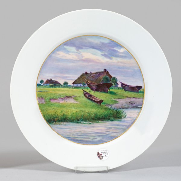 Im leicht vertieften Spiegel goldgerahmte, norddeutsche Uferlandschaft mit Reethäusern und Fischerbooten. Ausdrucksstarke polychrome Aufglasurmalerei, wohl von Rudolf Hentschel (1869 - 1951). Besitzeretikett. Schwertermarke. D. 27,5 cm.