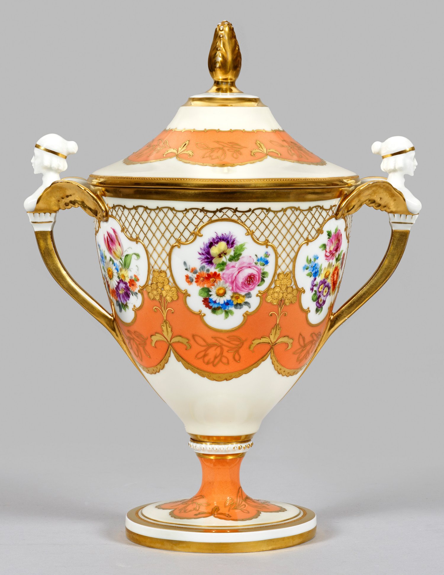 Pokalform, plastische Henkel mit geflügelten Frauenbüsten und Zapfenknauf-Deckel. Zwischen orange-, chamoisfarbenen und weißen Fonds reicher Reliefgolddekor aus Blütenranken, Gitterwerk sowie ausgesparten Kartuschen, darin farbige Blumenbuketts in polychromer Malerei. Nach historischem Modell Nr. 744 (um 1800.) Dekor-Nr. M 29 1/18. Minim. ber.; Manufakturmarke. H. 37 cm.