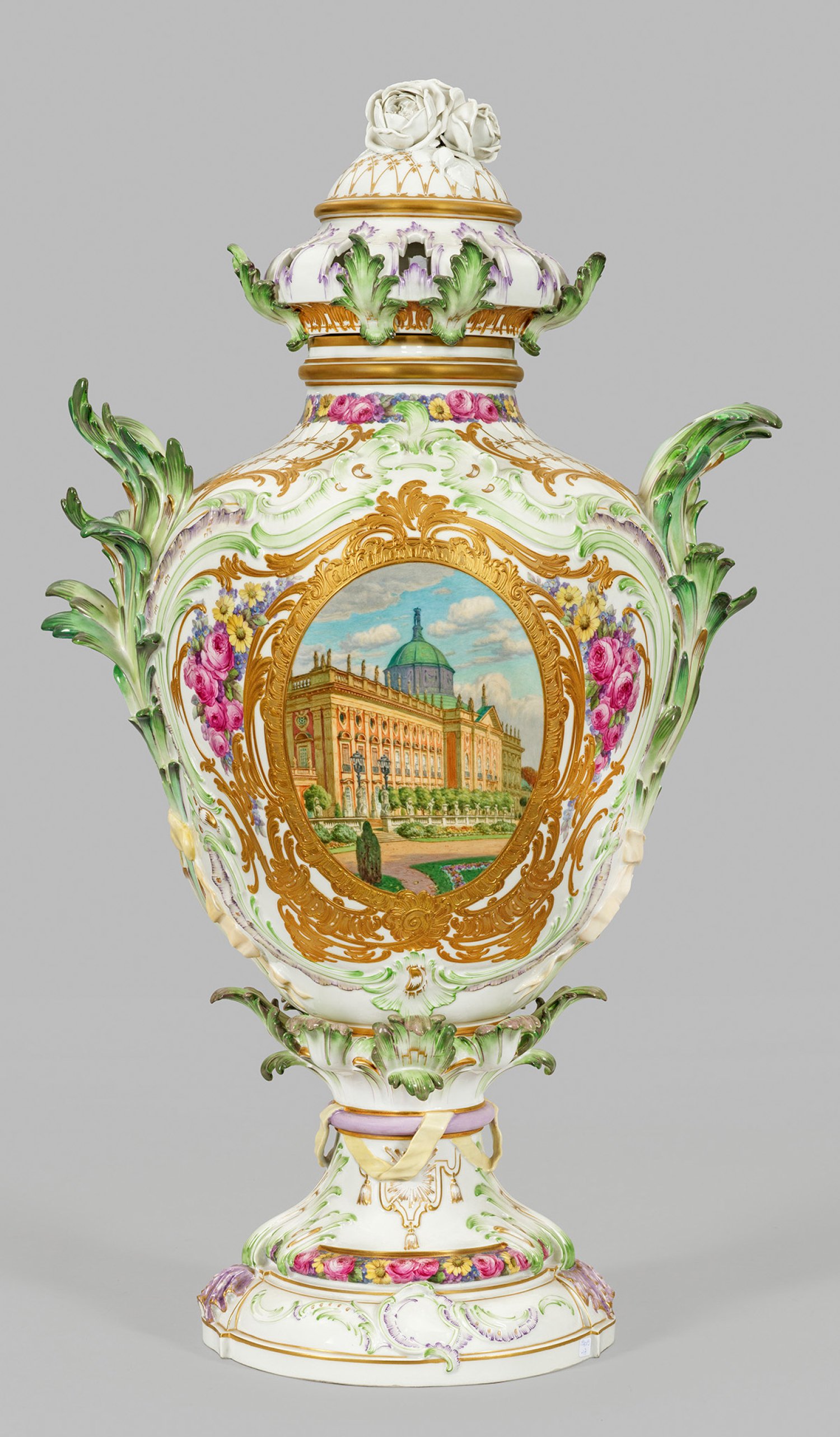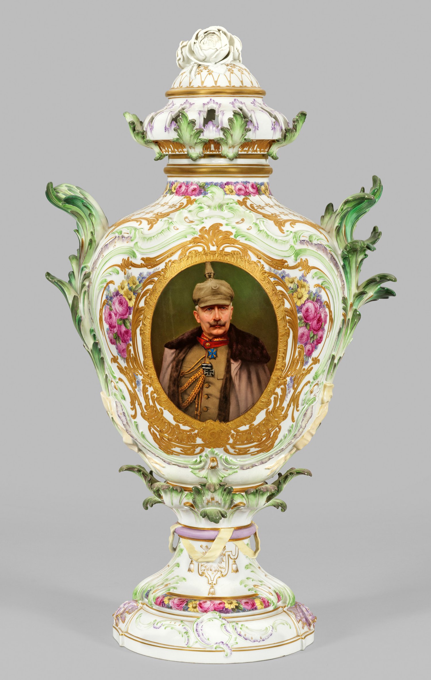 Mehrfach gestufter, kantig ausgezogener Rundfuß mit schleifenumwickelter Wulst sowie kelchförmig aufsteigenden, stark reliefplastischen Akanthusblättern. Birnförmig gebauchter Korpus mit gerundeter Schulter, in kurzen, gekehlten Hals übergehend. Seitlich hochragende Henkel in Gestalt von Schilfbündeln. Gedrückter, durchbrochen gearbeiteter Deckel mit großem, plastischem Knauf aus fein modellierten, aufgelegten Blüten, Knospen und Blättern. Beidseitig der Wandung großflächige, rocailleförmig von Reliefgold gerahmte Kartuschen. Schauseitig vor grünem Grund das Bildnis Wilhelm II. von Preußen in signifikanter Felduniform des 1. Weltkrieges einen Nerzmantel sowie Uniform und Pickelhaube tragend. Die Weste dekoriert mit dem Pour le mérite Orden sowie dem 1914 datierten Eisernen Kreuz. Als Vorlage diente ein Gemälde des Hofmalers Arthur Fischer (1872 - 1948), der für seine Werke häufig Fotografien verwendete. Rücks. Darstellung des zwischen 1763 und 1769 nach Entwürfen der Architekten Johann Gottfried Büring und Heinrich Ludwig Manger entstandenen Neuen Palais im Park Sanssouci in Potsdam, dem Hauptwohnsitz des deutschen Kaisers während seiner Regierungszeit zwischen 1888 bis 1918. Äußerst feine polychrome Malerei. Flächendeckend vegetabiler Reliefdekor aus Blatt-, Muschel- und Kartuschenwerk sowie reiche, stilisierte rocailleförmig geschweifte Reliefgoldornamentik. Fuß und Hals sowie in den seitlichen Reserven ein dichtes Blütenarrangement aus Rosen, Margeriten und Vergissmeinnicht. Entw. Alexander Kips. Das Kaiser-Porträt mit Maler-Sign. und dat."M. Dürschke (19) 17" für Max Dürschke (tätig an der KPM 1889-1931). Zepter- und Malereimarke. H. 85 cm.