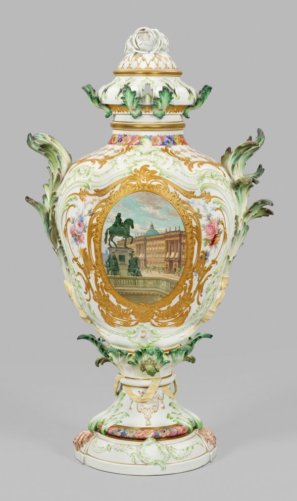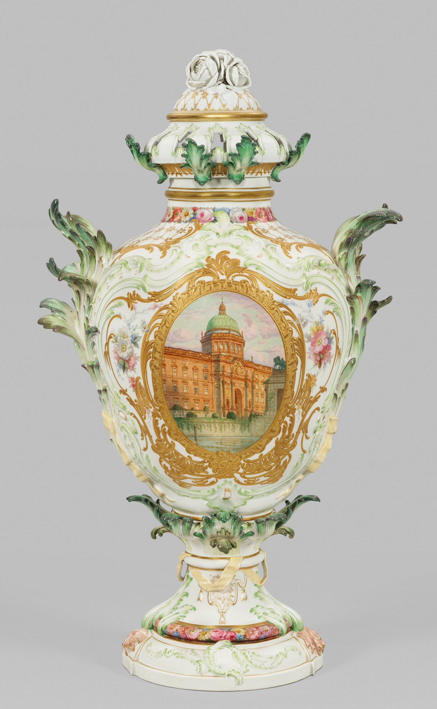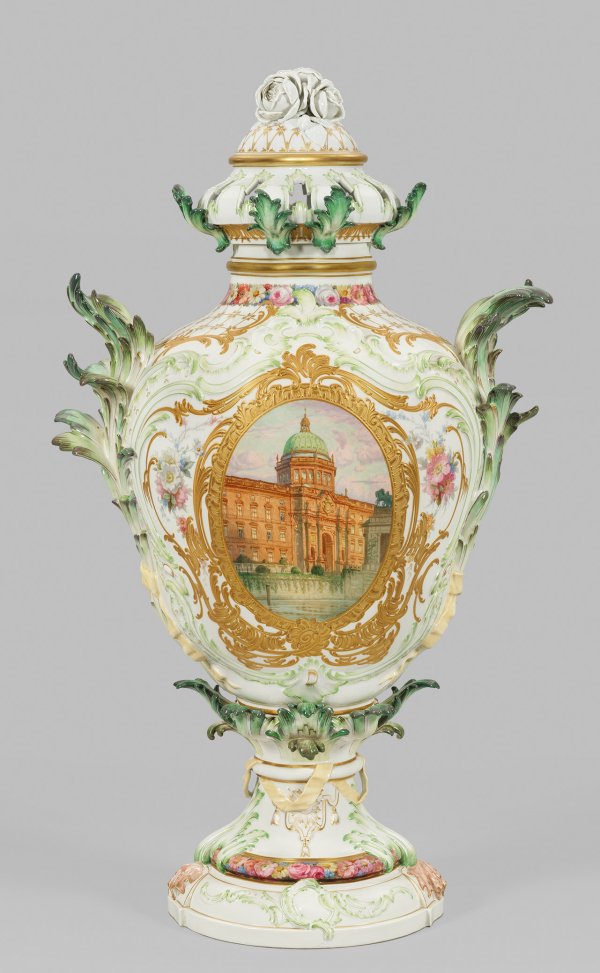 Mehrfach gestufter, kantig ausgezogener Rundfuß mit schleifenumwickelter Wulst sowie kelchförmig aufsteigenden, stark reliefplastischen Akanthusblättern. Birnförmig gebauchter Korpus mit gerundeter Schulter, in kurzen, gekehlten Hals übergehend. Seitlich hochragende Henkel in Gestalt von Schilfbündeln. Gedrückter, durchbrochen gearbeiteter Deckel mit großem, plastischem Knauf aus fein modellierten, aufgelegten Blüten, Knospen und Blättern. Beidseitig der Wandung großflächige, rocailleförmig von Reliefgold gerahmte Kartuschen. Darin die der Spree zugewandte Ansicht des Berliner Schlosses (bzw. Königliches Schloss) unweit der Langen Brücke mit Reiterstandbild des Großen Kurfürsten nach einem Gemälde des Vedutenmalers Carl Daniel Freydanck bzw. die ausschnitthafte Nahansicht mit Spree und zentraler Kuppel. Das Schloss entstand im Auftrag Friedrich I. von 1698 bis 1718 nach Entwürfen der Architekten Andreas Schlüter und Johann Friedrich von Eosander. Äußerst feine polychrome Malerei. Flächendeckend vegetabiler Reliefdekor aus Blatt-, Muschel- und Kartuschenwerk sowie reiche, stilisierte rocailleförmig geschweifte Reliefgoldornamentik. Fuß und Hals sowie in den seitlichen Reserven ein dichtes, weiches Blütenarrangement aus Rosen, Margeriten und Vergissmeinnicht. Entw. Alexander Kips. Malerzeichen für Hermann Friedrich Ismer (geb. 1874, in der KPM seit 1893 ausgebildeter Blumenmaler). Minim. rest.; Zepter- und Malereimarke. H. 87 cm.