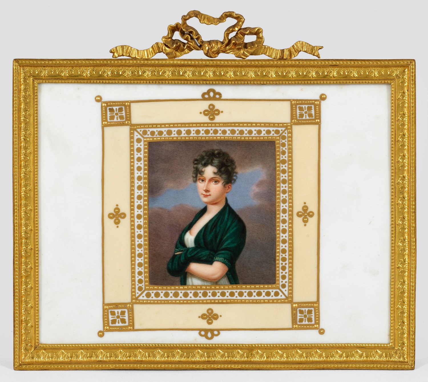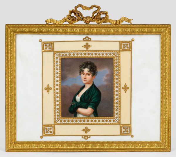 Rechteckige Form. Zentral Reliefgoldrahmung mit gelbem Fond. Darin das Halbporträt einer jungen gelockten Schönheit vor wolkenbehangenem Grund in feiner polychromer Malerei mit Gold. Vermutlich handelt es sich um Gräfin Isabella Freifrau von Hauer, geb. Gräfin Beroldingen (1782 - 1855) nach einer Miniatur von Joseph Sonntag. In engem verwandtschaftlichen Verhältnis zu dem Diplomat Paul Joseph von Beroldingen (1754 - 1831) stehend, der ab 1806 Geheimrat und Gesandter am Wiener Hof und später Oberhofmeister von den württembergischen Königinnen Katharina Pawlowna und Pauline war. Verso bez.; In vergoldetem Standrahmen aus Metall mit Schleifenbekrönung. Jahreszeichen. Geprägte Zepter- und KPM-Marke. Platte 19,5 cm x 15 cm. Rahmen max. 22 cm x 19,5 cm.