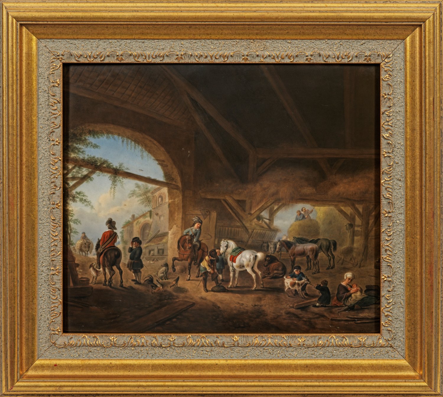 Rechteckige Platte. Lebendig geschildertes Stallinterieur mit der Ankunft einer Jagdgesellschaft in einer Scheune. Im Zentrum stehender, umsorgter Schimmel. Im Hintergrund weitere, im Stall untergebrachte Pferde und ein Bauernpaar bei der Unterbringung des Strohs. Am rechten Bildrand zwei mit einer Ziege spielende Kinder neben ihrer stillenden Mutter. Im offenen Torbogen mit Blick in das Dorf ein Reiter im Gespräch sowie eine pickende Hühnerschaar. Fein lasierende polychrome Malerei, wohl von Emil Ens. Nach einem 1649 entstandenen Ölgemälde von Philips Wouwerman, welches sich heute in der Gemäldegalerie Alte Meister der Staatlichen Kunstsammlungen Dresden befindet (Gal.-Nr. 1424). Rücks. sign. "Pferde Stall P. Wouwerman g. v. E. Ens 1855". Vergoldeter Holzrahmen. Geprägte KPM-Zeptermarke. Plattenmaß 33,5 cm x 28 cm. Rahmen 45 cm x 40,5 cm.
