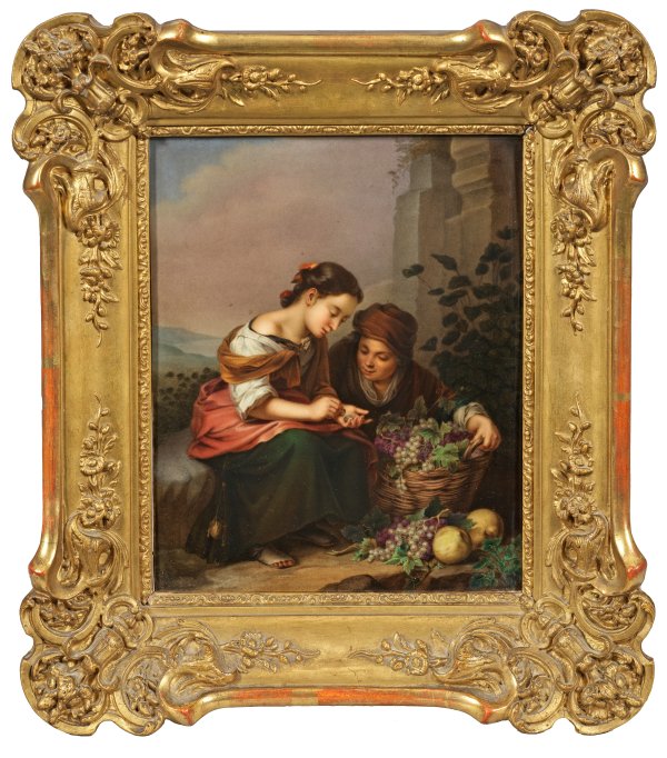 Rechteckige Platte. In weitläufiger, seitlich von einer Ruine begrenzten Landschaft auf einer Steinbank sitzendes Mädchen, den Blick auf die Münzen in ihrer Hand gerichtet. Daneben ein die Szene beobachtender Junge, den am Boden stehenden, mit Trauben gefüllten Weidenkorb mit einer Hand umgreifend. Fein lasierende, polychrome Malerei. Nach dem um 1670/1675 entstandenen Ölgemälde von Bartolomé Esteban Murillo (Bayerische Staatsgemäldesammlungen, Alte Pinakothek München, Inv.-Nr. 497). Vergoldeter Holzrahmen. Verso handschriftliche bez.; Geprägte Manufakturmarke. Plattenmaß 20,5 cm x 16 cm. Rahmen 31 cm x 28 cm.