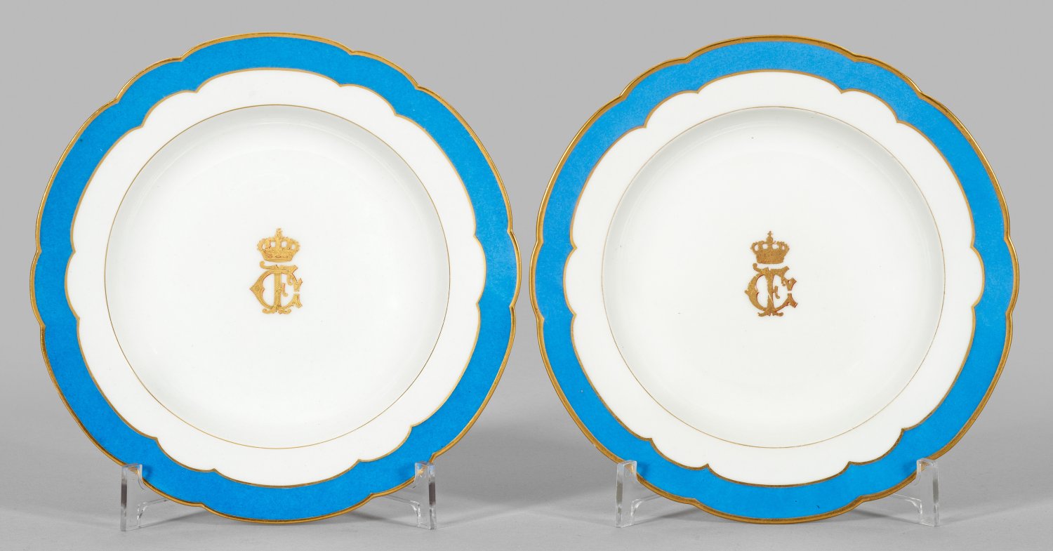 A pair of soup plates with the monogram of Frederick Charles Prince of Prussia. Minor rubbed. Sceptre- and painter's mark and KPM eagle mark.