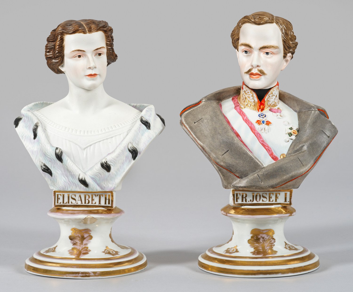 Porzellan und Biskuitporzellan. Auf eingezogenem Rundsockel die Büsten des bedeutenden Kaiserpaares Franz Joseph I., Kaiser von Österreich sowie König von Ungarn und Böhmen (1830 - 1916) in ordensgeschmückter Weste und Elisabeth von Österreich (1837 - 1898), auch bekannt als "Sissi". Polychrome Malerei mit reicher Goldstaffage. Bez. "Elisabeth" und "Fr. Josef I." Ber.; Teilw. unw. rep.; Brandriss. Geprägte Manufakturmarke. H. 32 cm - 33 cm.