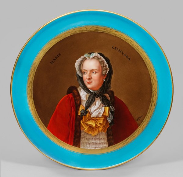 Runde, leicht vertiefte Form mit breiter, türkisblauer Fahne. Der eingefasste Rand mit goldradierten Blättern, von Kreuzbändern gehalten, vor kapuzinerbraunem Grund das Brustbildnis der Madame Maria Leszczynska (1703 - 1766), die nach der Heirat mit Ludwig XV. zur Königin Frankreichs wurde. Als Vorlage diente wohl ein Ölgemälde von Maurice-Quentin de La Tour. Feine polychrome Malerei mit reicher Goldstaffage. Künstler-Sign. "Leber J'apres Latour". Minim. rest.; Manufakturmarke. D. 45 cm.