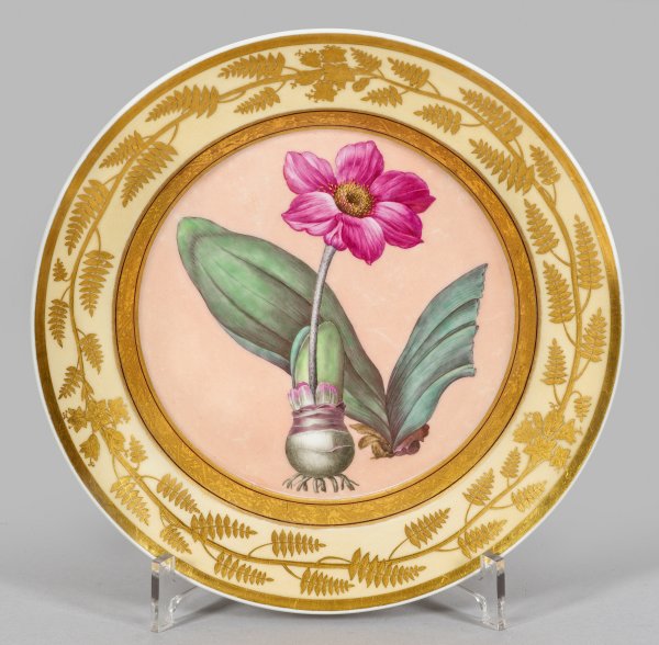 Runde, leicht vertiefte Form "Konisch", mit glattem Rand. Im Spiegel auf lachsfarbenem Fond die Darstellung der Blutblume. Das Steigbord mit reich vergoldetem, schwarz konturiertem Ornamentband aus Reliefgold. Auf der Fahne mit zartgelbem Grund ein goldradiertes Band der Pflanze. Äußerst feine polychrome Malerei mit reicher Goldstaffage. Verso lat. bez. "Haemanthus". Minim. ber./rest.; Zepter- und Malereimarke. D. 23,5 cm.