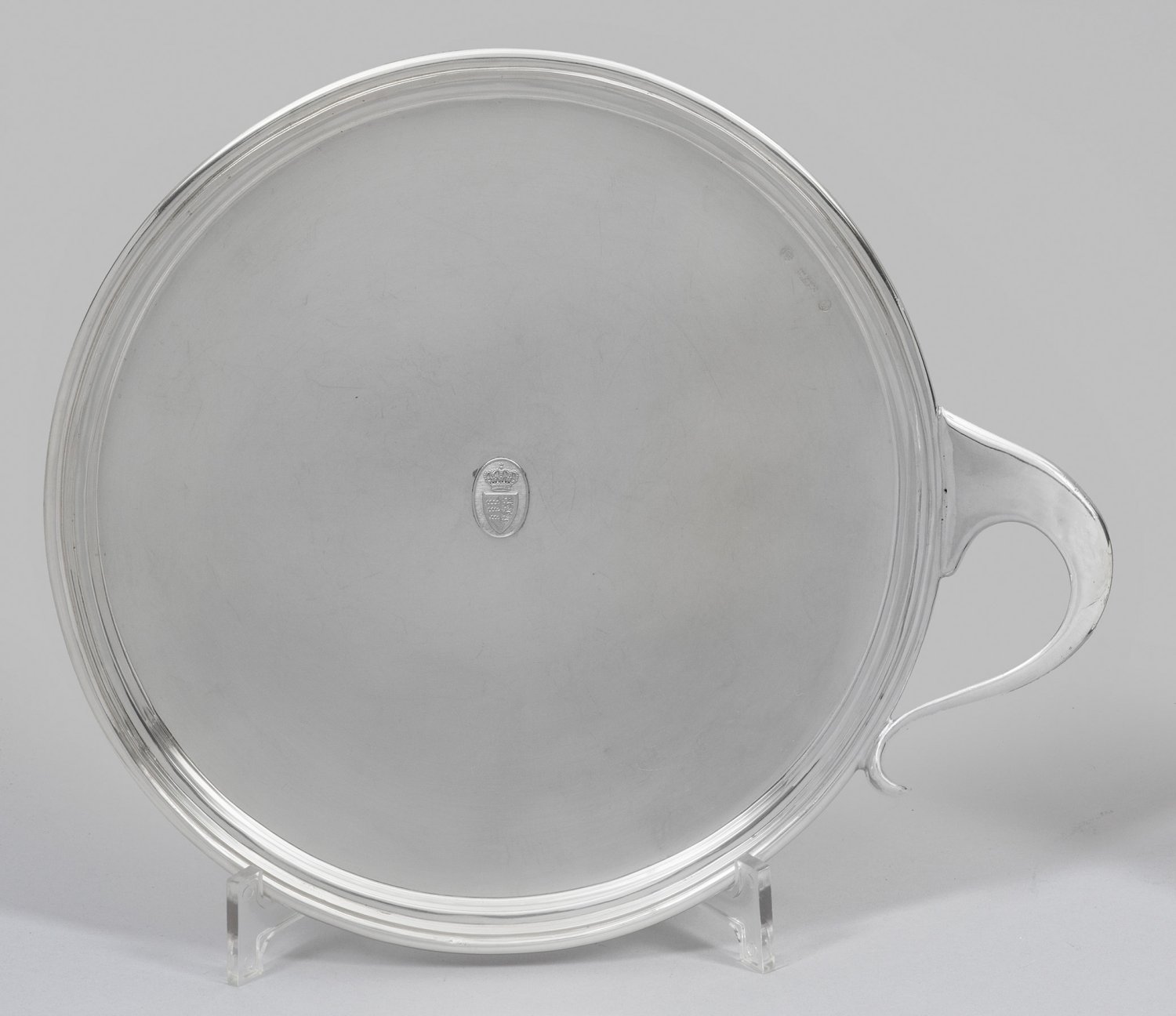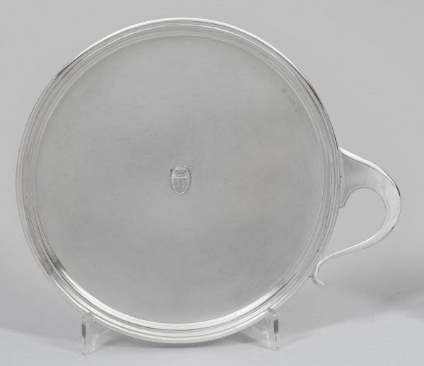 Silber. Runde Grundform mit flachem Spiegel, doppelt gestuftem Rand und seitlichem, S-förmig geschwungenem Henkel. Mittig im Spiegel eine kleine ovale Kartusche mit dem Wappen Württembergs unter Königskrone. Gest. 13 Lot, Beschauzeichen, Herstellerzeichen. Gew. ca. 525 g. 28,5 cm x 24 cm.