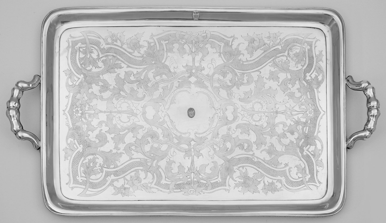 Silber. Rechteckige Form mit gerundeten Ecken. Glatter Spiegel mit leicht ansteigender, am Rand ausschwingender und von Profillinie umzogener Fahne. Seitlich zwei geschweifte Henkel. Der Spiegel verziert mit gravierten Akanthusblättern, Blüten, Knospen und einem umlaufenden Streifen Gitternetzdekor. Mittig im Spiegel und auf der Fahne jeweils eine kleine ovale Kartusche mit dem Wappen Württembergs unter Königskrone. Auf der Unterseite als Verstärkung ein befestigter Holzrahmen. Leichte Gebrauchsspuren. Gest. 13 Lot, Beschauzeichen, Herstellerzeichen. Ges.-Gew. ca. 3430 g. 80,5 cm x 46,5 cm.