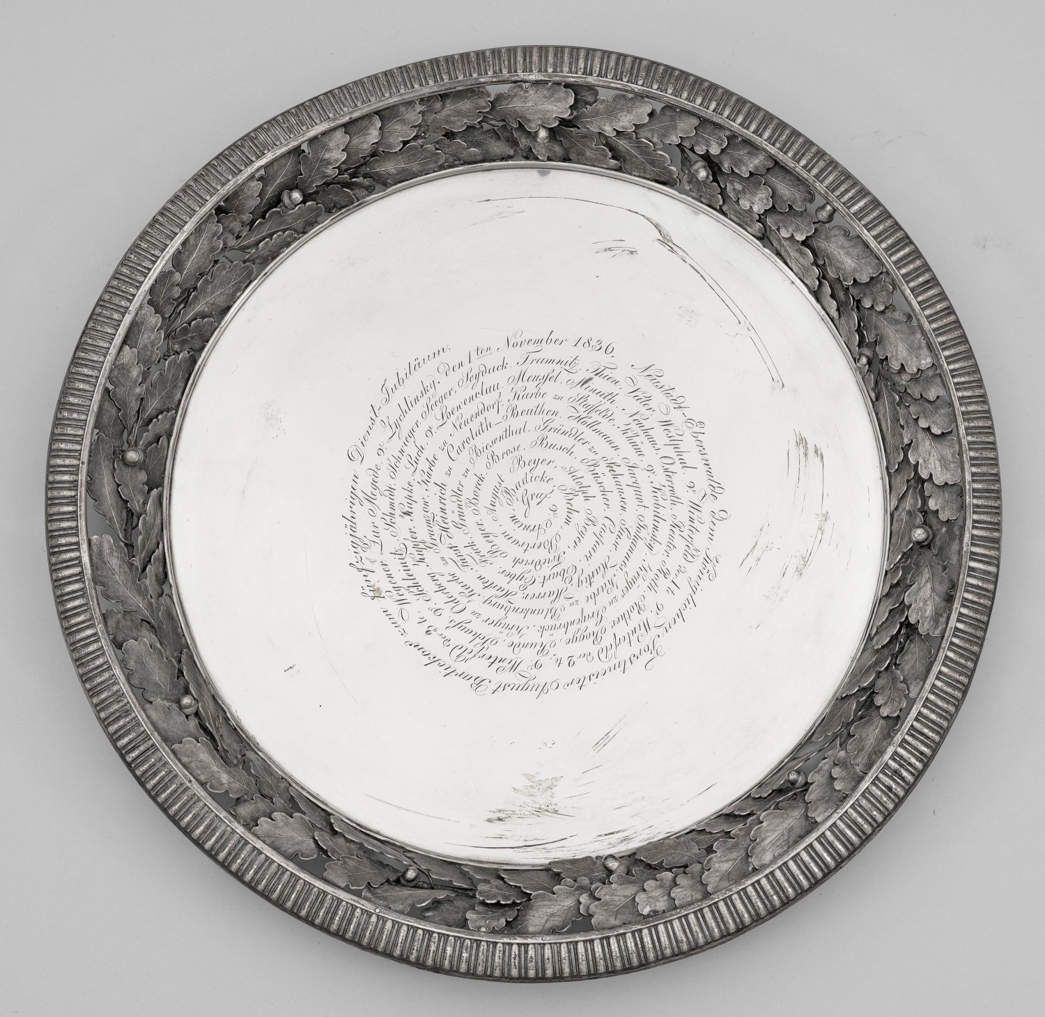 Silber. Rundes Tablett mit flachem Spiegel und aufschwingender Fahne in Form eines plastisch gearbeiteten, naturalistisch gestalteten Kranzes aus Eichenlaub mit feinem Astwerk, Blättern und Eicheln, gerahmt von einem ausgestellten Rand mit Zungenfries. Mittig im Spiegel von innen nach außen in Form einer Spirale geschriebene gravierte Inschrift: "Graf v. Arnim, Badicke, August Beyer, Adolph Beyer, Friedrich Beyer, Borock, Brose, Busch, Büscher, Caspari, Eber, Eyber, Frick. Gründer zu Biesenthal, Gründer zu Seehausen, Guse, Hartig, Harrer, Harten, Fürst Heinrich zu Carolath-Beuthen, Hollmann, Jacquot, Johannes, Karbe zu Blankenburg, Karbe zu Granow, Karbe zu Neuendorf, Karbe zu Staffelde, Khüne, v. Kobilinsky, Krüger zu Grafenbrück, Krüger zu Oderberg, Kupfer, Kupke, Lach, v., Loewenclau, Meusfel, Minuth, Neuhaus, Osterroth, Reuther, Roth, Rother, Rogge, Runde, Schaufs v. Schleinitz, Schmidt, Schwieger, Seeger, Seydack, Tramnitz, Thien, Vater, Westphal, v .Winterfelde der 1te, v. Winterfelder der 2te, v. Winterfelde der 3, Wegener, Zur Megede, v. Zychlinsky. Den 1. November 1836. Neustadt-Eberswalde dem königlichen Forstmeister August Bartickow zum fünfzigjährigen Dienst-Jubiläum." Minim. rest.; Gest. 14 Löth, Beschauzeichen B. G. F. Andreack (wird Beschaumeister 1819) und Herstellerzeichen, Jahresbuchstabe. Gew. ca. 1870 g. D. 46,5 cm.