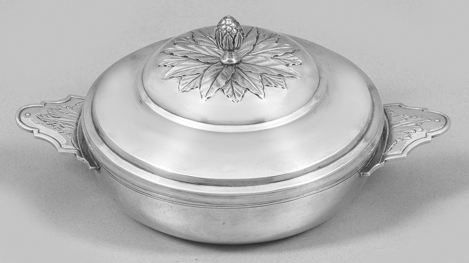 sog. Ecuelle. Silber. Flacher Stand, übergehend in konische, glatte Schale. Seitlich zwei passig geschweifte, randprofilierte Handhaben mit reliefiertem Blattdekor. Aufgewölbter Steckdeckel mit Knospenknauf über Rosette aus lanzettförmigen Blättern. Innen vergoldet. Gest. 13 Lot, Beschauzeichen, Meister Jacob Heinrich Alberti (wird Meister 1764), Marken teilw. unkenntlich gemacht, wohl Jahresbuchstabe. Gew. ca. 165 g. H. 6 cm. D. 8,8 cm.