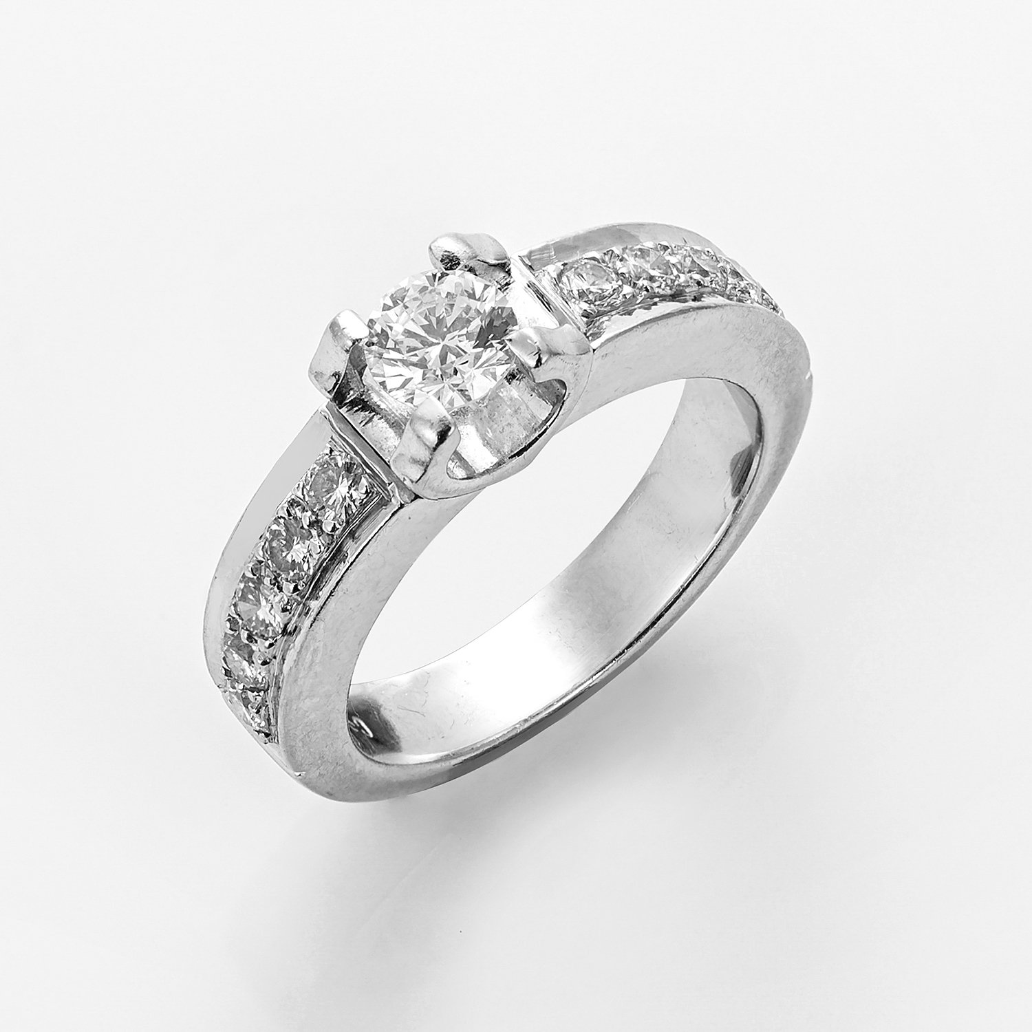 Ring set with a brilliant solitaire approx. 0,50 ct. (F-G/vs) and 10 diamonds approx. 0,50 ct., in platinum.