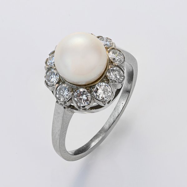 Ring set with a culture pearl approx. 8,3 mm and diamonds approx. 1,00 ct., in 18 k white gold.