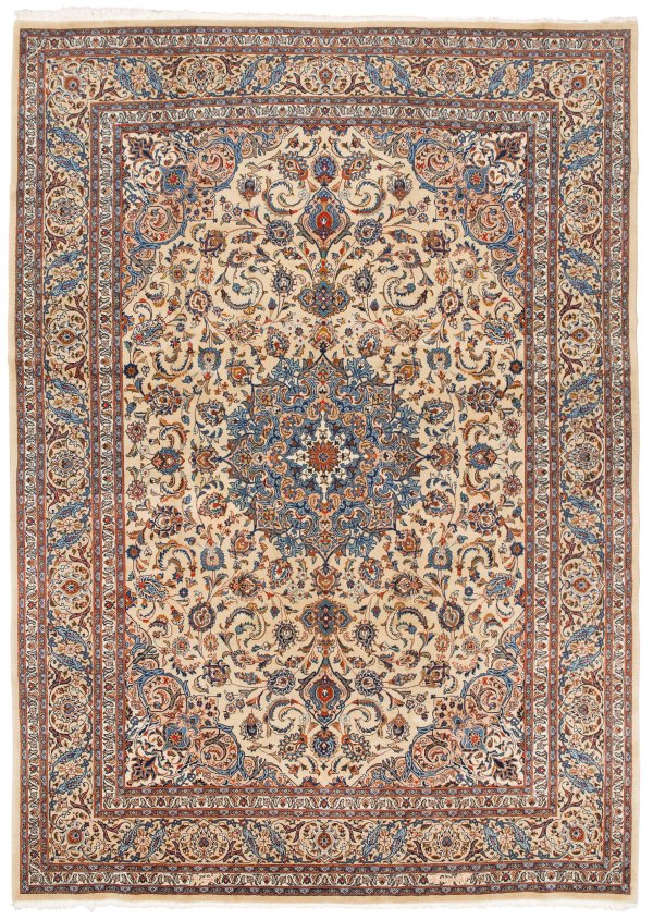 Persien. Wolle auf Baumwolle. Im beigefarbenen Innenfeld hellblaues Rundmedaillon mit Anhängern sowie passig geschweifte Ecklösungen. Flächendeckend dichte Palmettenmusterung. Umlaufend breite, korrespondierende Bordüre, flankiert von schmalen Bändern. Sign.; 446 cm x 247 cm.