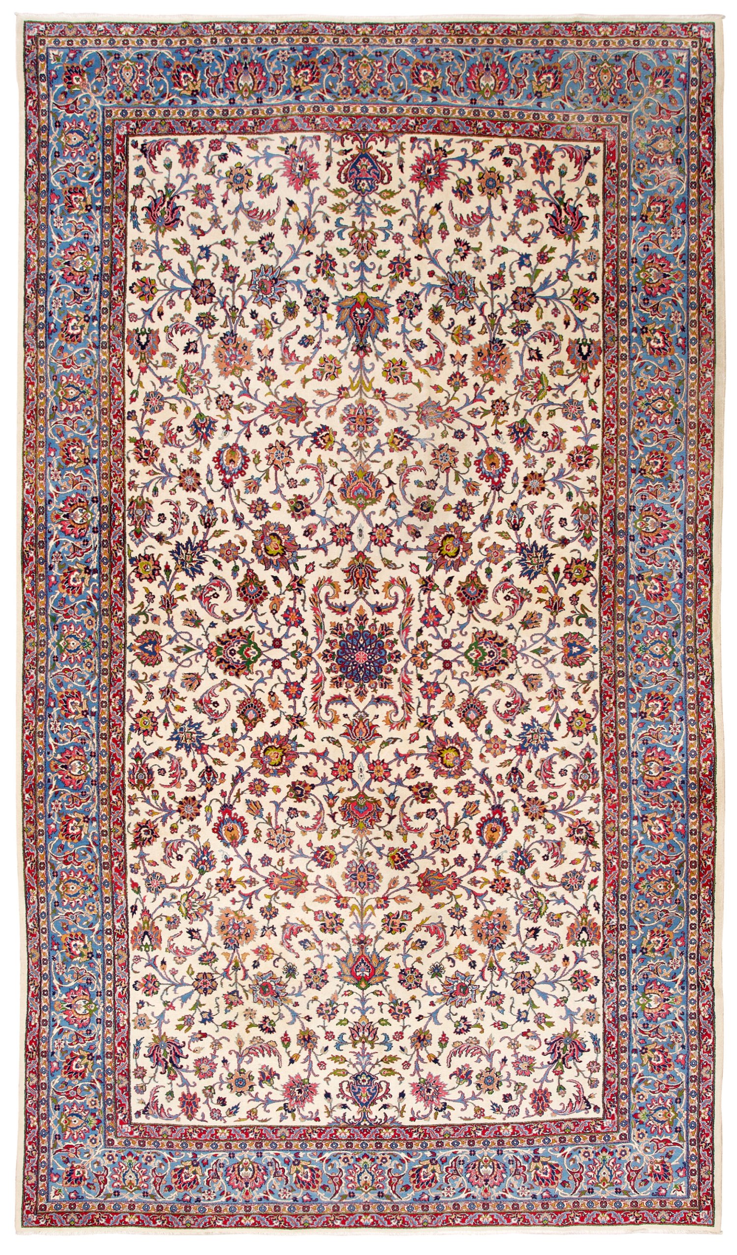 Persien. Um 1940. Wolle auf Baumwolle. Im elfenbeinfarbenen Innenfeld flächendeckend durchlaufende Musterung aus üppigen Palmettenranken. Umlaufend breite, hellblaue Hauptbordüre aus Palmetten, flankiert von schmalen Bändern. Belaufen. 500 cm x 300 cm.