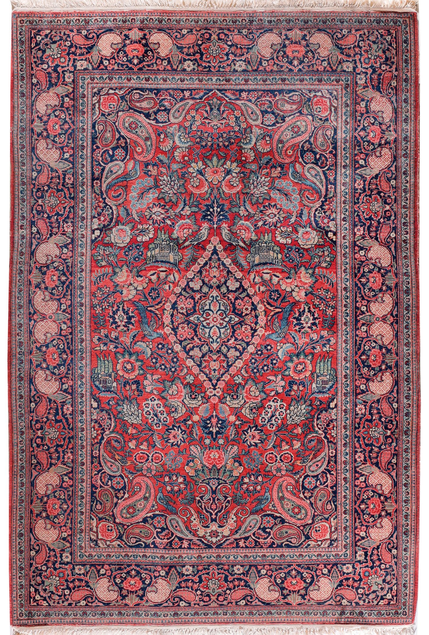 Persien. Um 1940. Korkwolle auf Baumwolle. Im hellroten Innenfeld gestrecktes Zentralmedaillon sowie passig geschweifte Ecklösungen mit Bothéblüten in Dunkelblau. Flächendeckende Musterung aus Architekturmotiven und großzügig angelegte Blütenranken. Umlaufend breite, dunkelblaue Hauptbordüre aus Arabesken, Bothés und Blüten. 210 cm x 136 cm.
