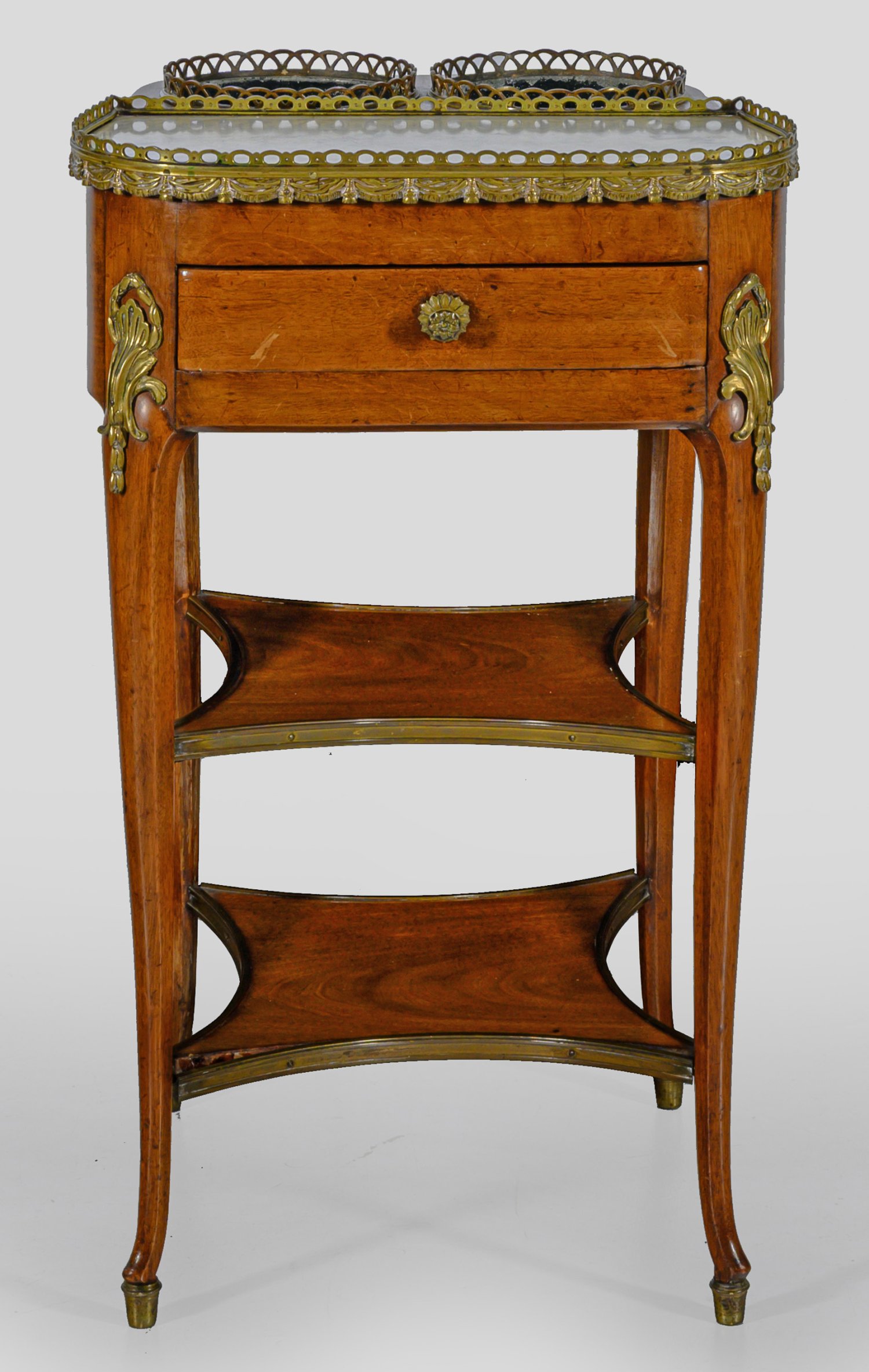 Mahagoni. Allseitig bombierter, einschübiger Korpus aus sich konisch verjüngenden, geschweiften Beinen, durch zwei jeweils konkav eingezogene Ablagefächer verbunden. Deckplatte aus weiß grau gemasertem Marmor mit umlaufend, durchbrochen gearbeiteter Galerierahmung sowie dahinter eingelassene Behälter aus lackiertem Blech. Schlagstempel-Sign. F.A.CANNABAS(!). H. 77 cm. 47 cm x 46 cm.