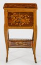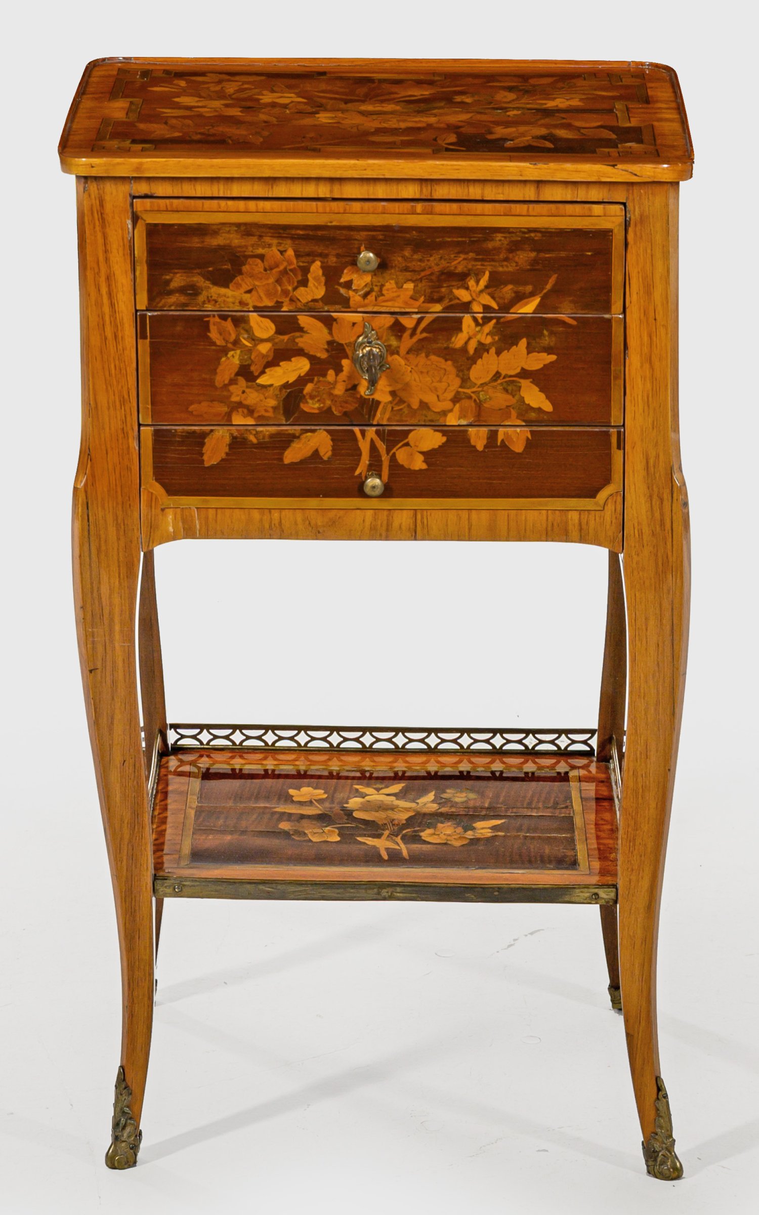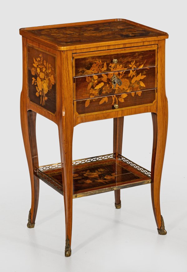 Rosenholz, furniert sowie Einlagen aus unterschiedlichen, teilw. gefärbten Edelhölzern. Gerader, rechteckig angelegter Korpus, flankiert von schmalen Ecklisenen, in hohe, leicht geschwungene Beine übergehend. Unterhalb eingezogenes Ablagefach. In der gegeliederten Front drei optisch verbundene Schubladen sans traverse, die oberste mit Facheinteilung. Gering überstehende Deckplatte mit flacher Galerierahmung. Allseitig breit gerahmte Furnierfelder mit Blütenintarsien. H. 71 cm. 40,5 cm x 31 cm.