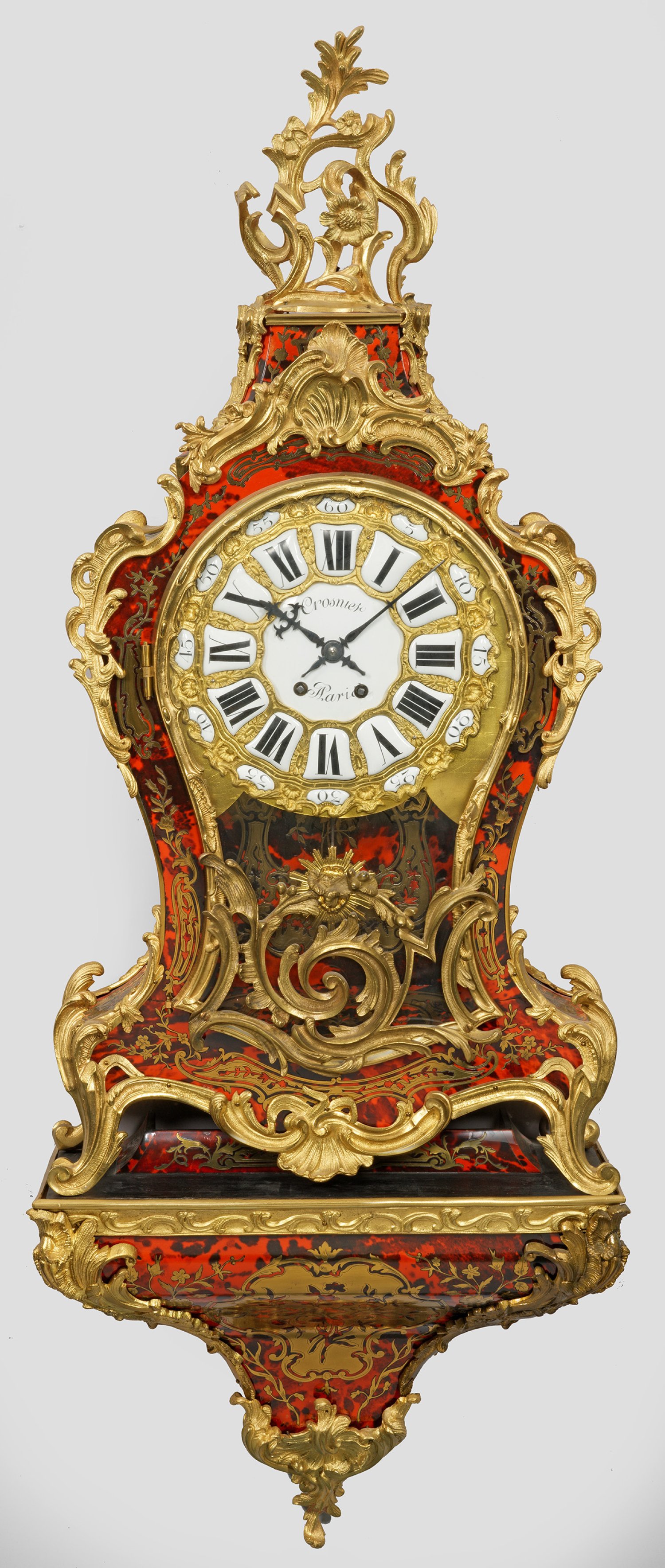 Flächendeckender Fond aus rotgeflammtem Lack mit ornamentierten Messingeinlagen in sog. Boulle-Technik. Balusterförmiger Korpus, umgeben von üppigen Rocaillen mit geschweift ansteigendem oberen Abschluss und durchbrochen gearbeiteter Bekrönung. Verglastes, reliefiertes Zifferblatt mit Emailreserven, bez. "Crosnie Paris". Werk mit Pendelfeder sowie Halbstundenschlag auf Glocke. Unterhalb korrespondierende Konsole. Ges.-H. 121 cm. 46 cm x 22 cm.
