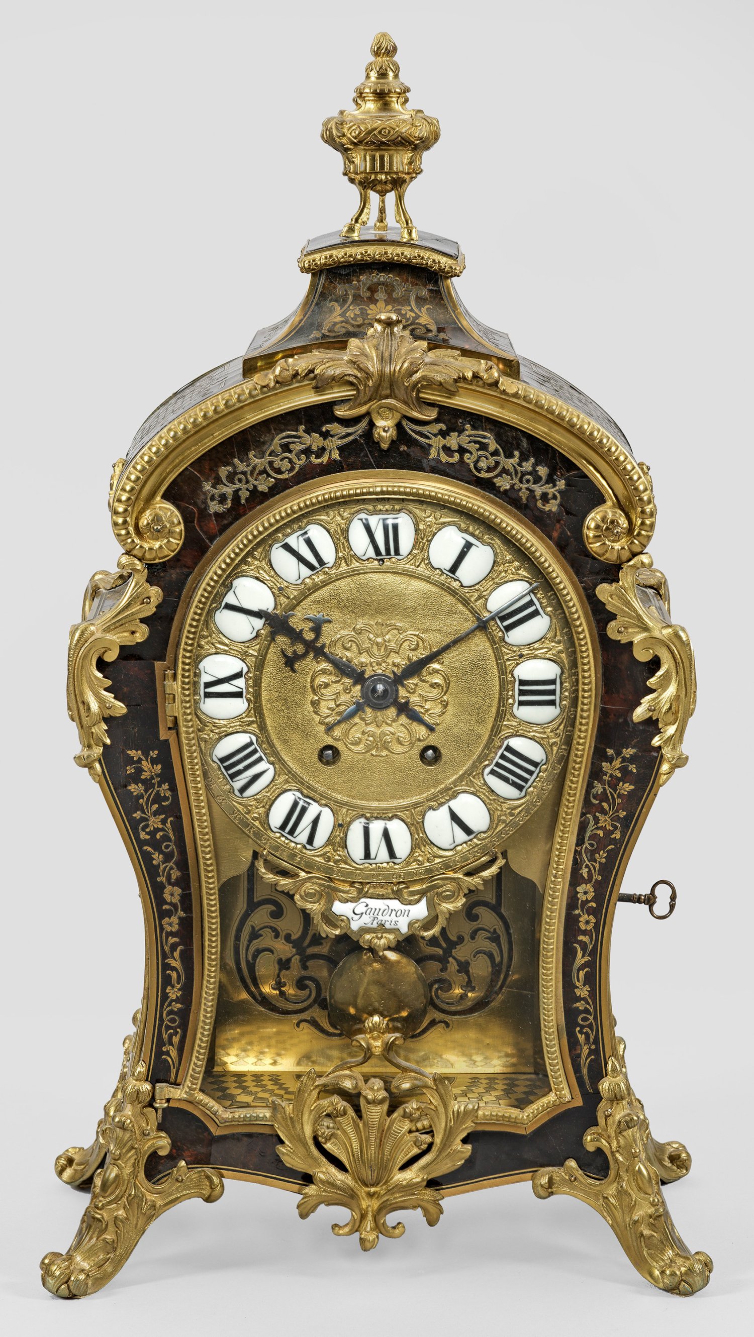 Flächendeckender Fond aus Chinalack und ornamentiertem Messing in sog. Boulle-Technik sowie Applikationen aus vergoldeter Bronze. Balusterförmiger, dreiseitig verglaster Korpus, umgeben von Blattvoluten, mit geschweift ansteigendem oberen Abschluss und Vasenbekrönung. Zifferblatt mit Emailreserven, bez. "Gaudron Paris". Pendulenwerk mit Pendelfeder sowie Halbstundenschlag auf Glocke. H. 57 cm.