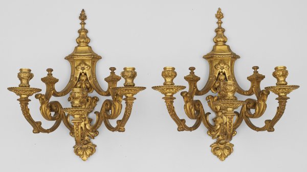 3-flg.; Bronze, vergoldet. Balusterförmiges, blattreliefiertes Wandschild mit pagodenartigem Abschluss. Davon ausgehend stark geschwungene Leuchterarme aus gegeneinander gestellten Voluten mit vasenförmigen Tüllen über großen Traufschalen. H. 48 cm.