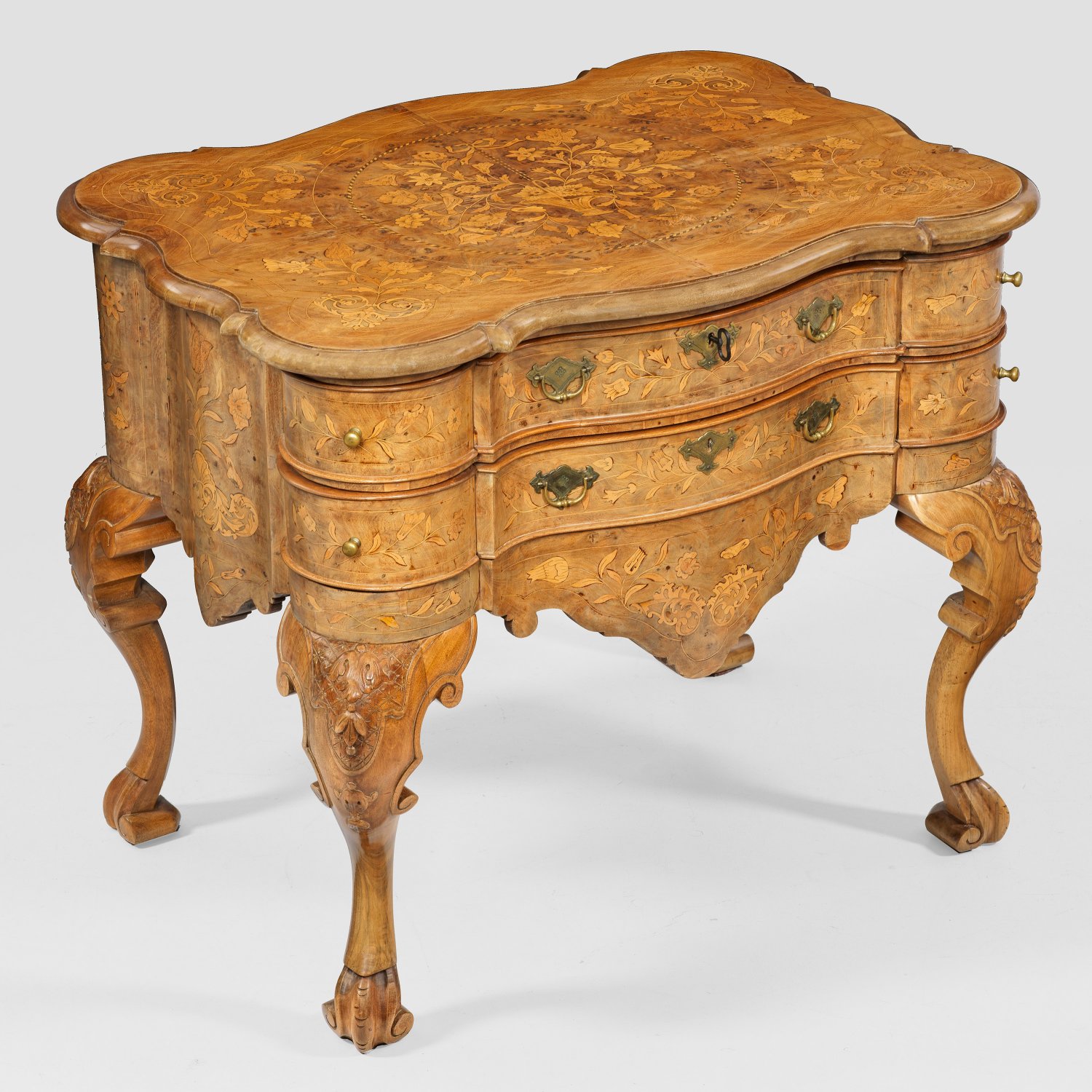 Nussbaum und Nussbaummaser, massiv und furniert sowie Einlagen aus unterschiedlichen Hölzern. Allseitig bombierter Korpus mit weit ausgezogener Zarge auf stark geschwungenen, blattreliefierten Volutenbeinen. In der gegliederten Front sechs Schubladen unterschiedlicher Größe. Korrespondierende, umlaufend profilierte Deckplatte. Allseitig reicher Floraldekor. H. 75 cm. 88 cm x 64 cm.