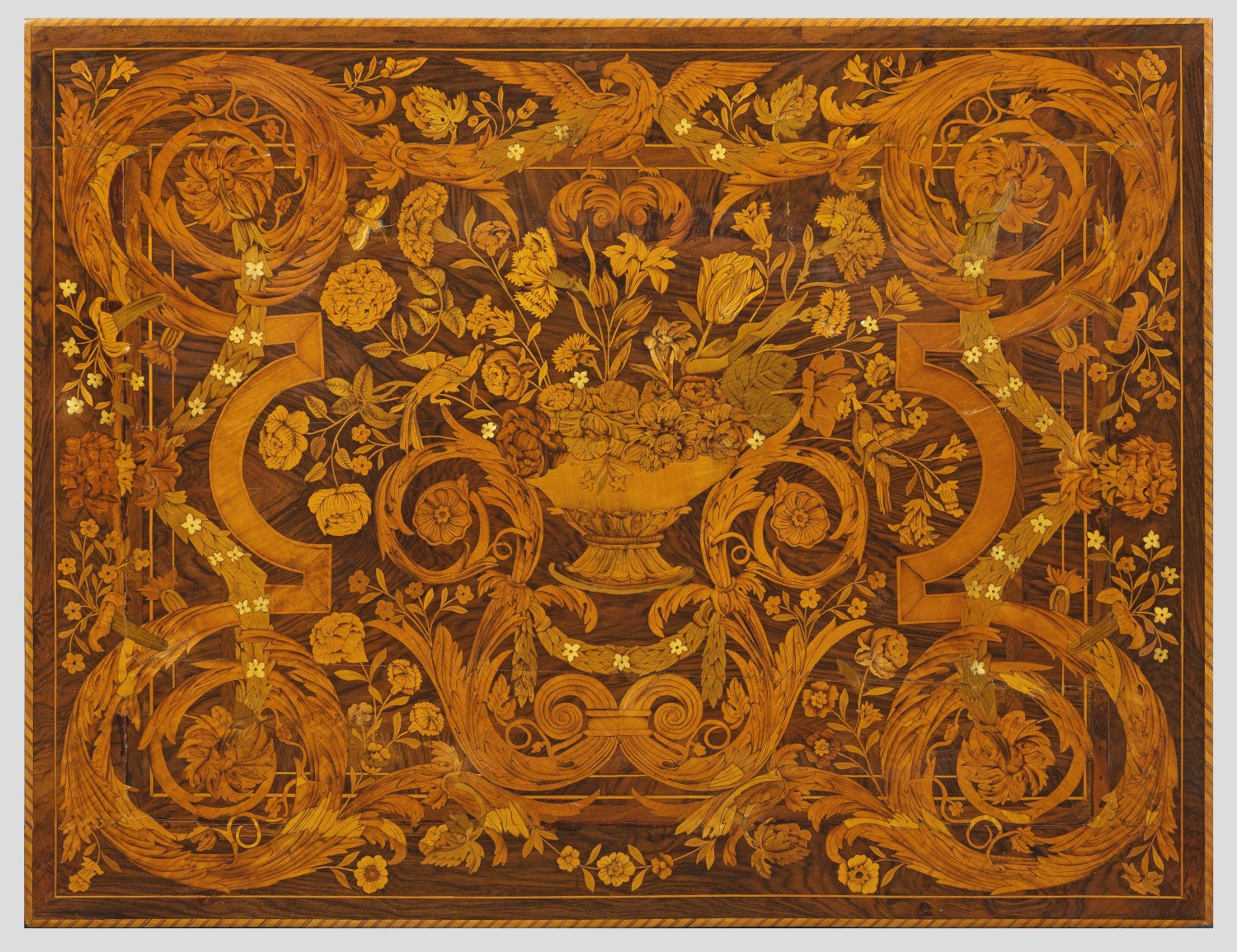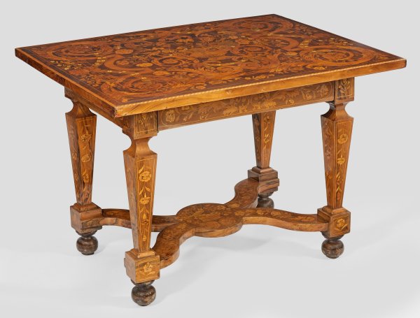 Nussbaum und Nussbaummaser, furniert sowie reiche Einlagen aus unterschiedlichen Edelhölzern und Knochen. Gerader, einschübiger Zargenkasten auf konischen, gekanteten Balusterbeinen, unterhalb durch breite, geschwungene Stege verbunden. Weit überstehende, rechteckige Deckplatte mit flächendeckendem, aufwändigen Intarsiendekor aus üppigen, eingerollten Voluten unterschiedlichen Blüten, Adlermotiv und Festons. Unterhalb Monogrammetikett. H. 76 cm. 110 cm x 84 cm.