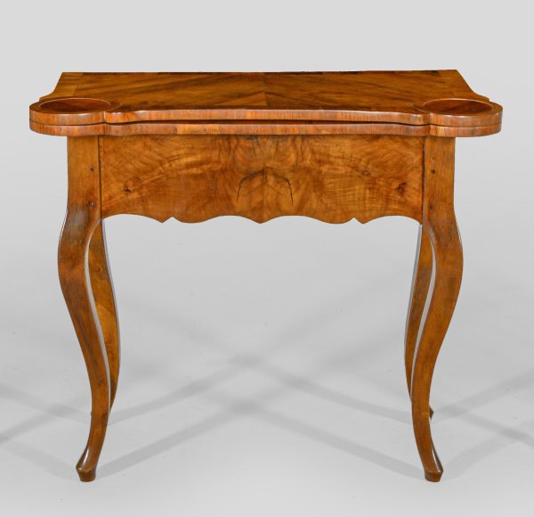 Nussbaum, furniert und Buchenholz. Passig geschweifte Zarge auf stark geschwungenen Beinen. Weit überstehende, aufklapp- und drehbare Deckplatte mit gespiegelt angeordneten Furnierfeldern und gerundeten Reserven in den Ecken. H. 76 cm. 88 cm x 43/86 cm.