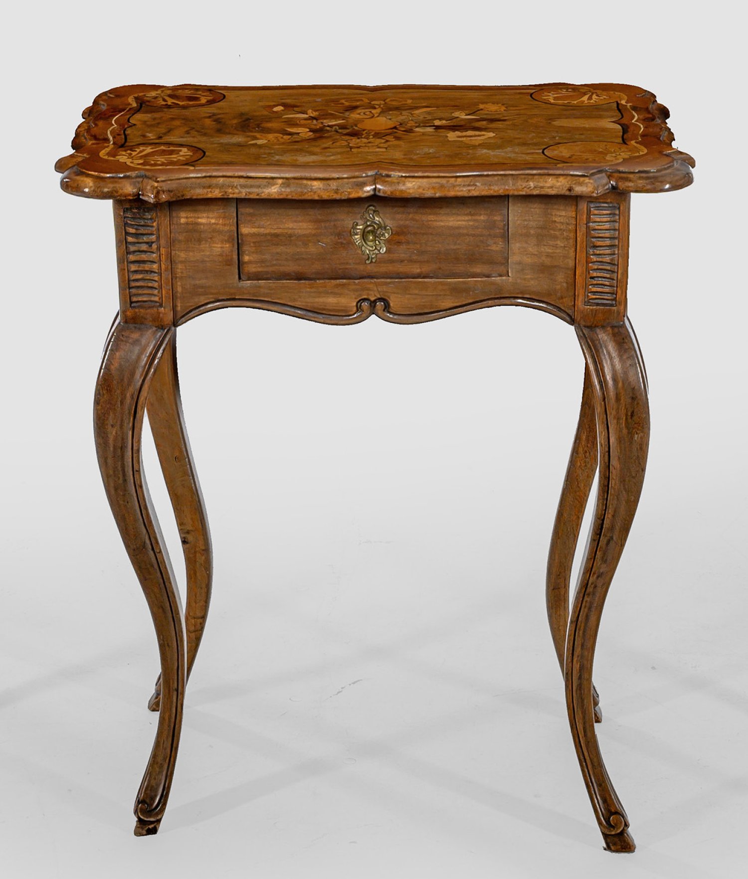 Nussbaum, massiv. Passig geschweifter, einschübiger Zargenkasten auf hohen, geschwungenen Beinen. Weit überstehende Deckplatte mit intarsierten Attributen der Musik und Blüten. H. 73,5 cm. 61 cm x 44 cm.