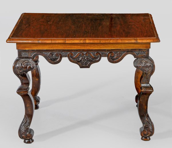 Nussbaum, teilw, reliefplastisch geschnitzt. Passig geschweifte Zarge mit Volutenmotiven auf stark geschwungenen, gekanteten und blattreliefierten Beinen als Träger für erg. profilierte Deckplatte. H. 46 cm. 61 cm x 51 cm.