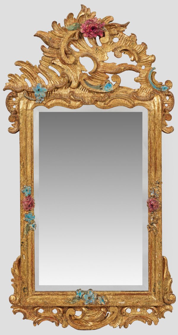 Holz geschnitzt, teilw. polychrom gefasst und vergoldet. Schmale, hochrechteckige Spiegelrahmung mit reliefplastischen Blüten. Hohe, durchbrochen gearbeitete, asymmetrisch angelegte Bekrönung aus üppigen Rocaillen sowie korrespondierender unterer Abschluss. Facettiertes Spiegelglas. 75 cm x 39 cm.