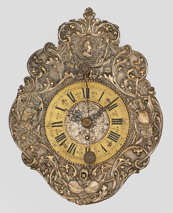 sog. Telleruhr. Messing, teilw. versilbert sowie polychrom gefasstes Metall. Kartuschenförmige Front aus üppigen, erhaben reliefierten, eingerollten Blattvoluten sowie kleinem Porträtmedaillon. Rückseitig gekanteter Korpus. Mechanisches Werk mit Vorderzapplerpendel und Spindelhemmung. H. 33 cm. 25 cm x 5,5 cm.