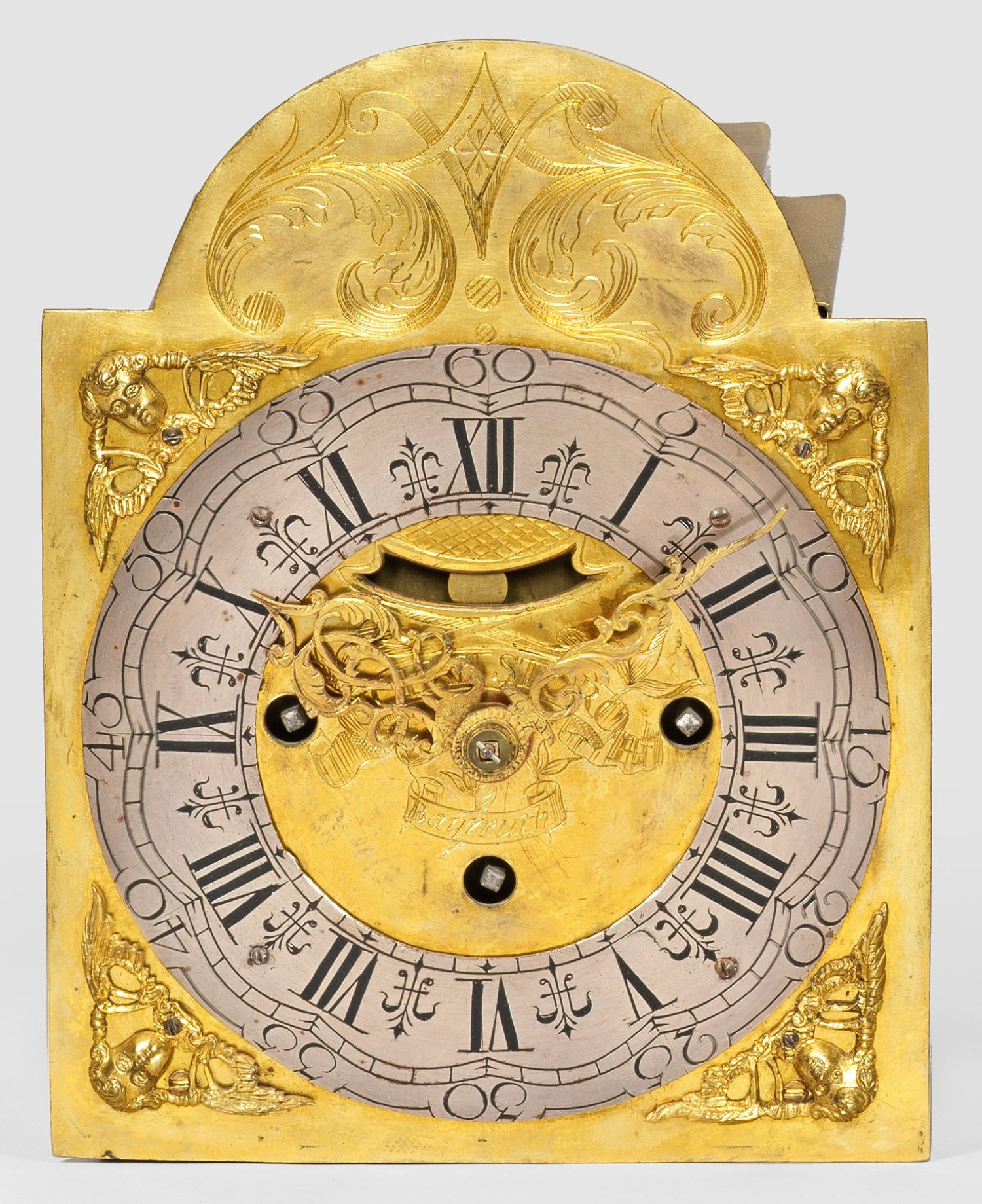 Messing. Flaches Zifferblatt mit reliefierten Voluten, plastischen Puttenköpfen, Schaupendel sowie aufgelegtem Ziffernring, bez. Johann Storch Bayreuth. Unvollständiges Werk mit Spindelhemmung. Erg. Gehäuse. H. 19 cm. 14 cm x 7 cm.